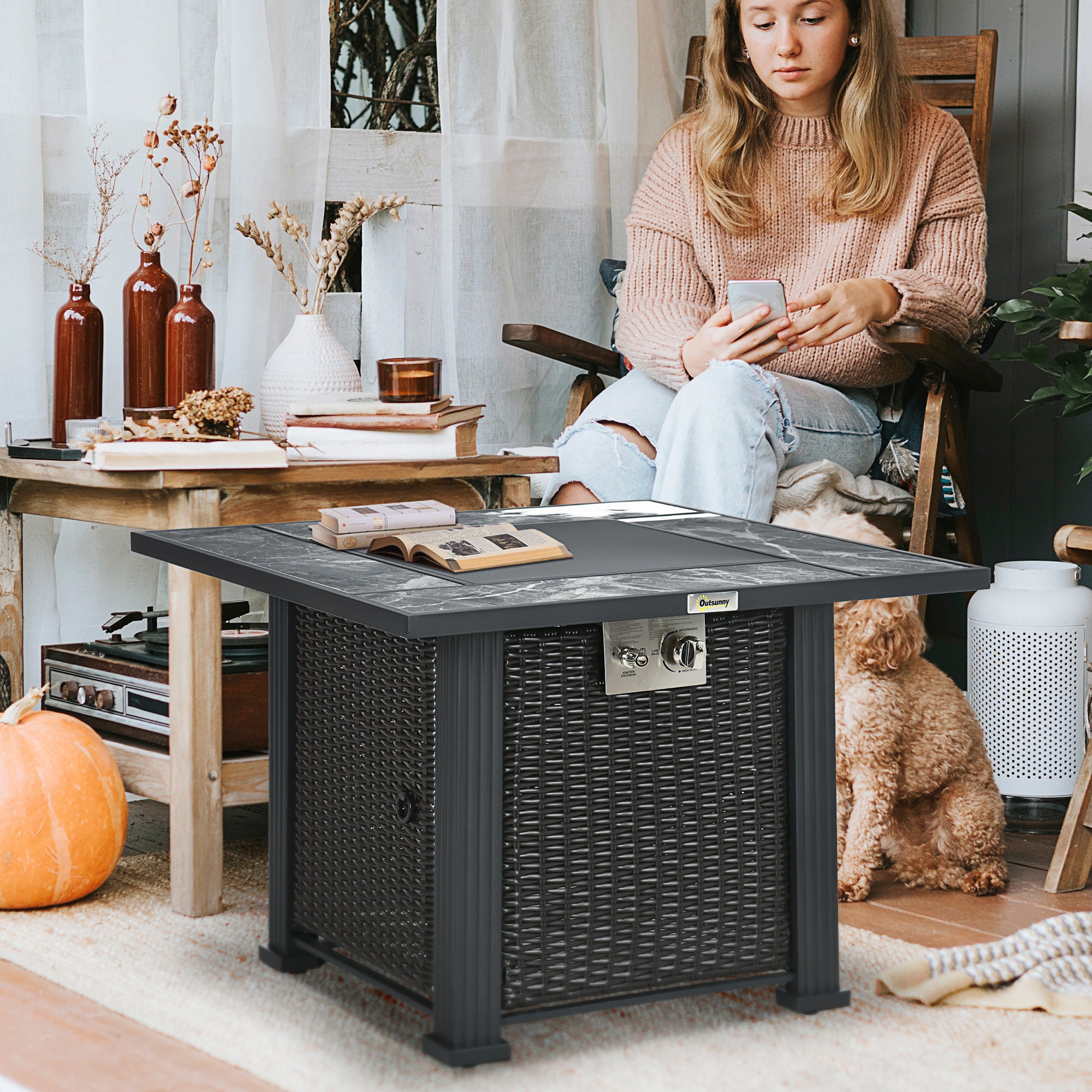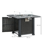 Outdoor PE Rattan Gas Fire Pit Table, Patio Square Propane Heater with Marble Desktop, Rain Cover, Glass Windscreen, and Glass Stones, 50,000 BTU, Black