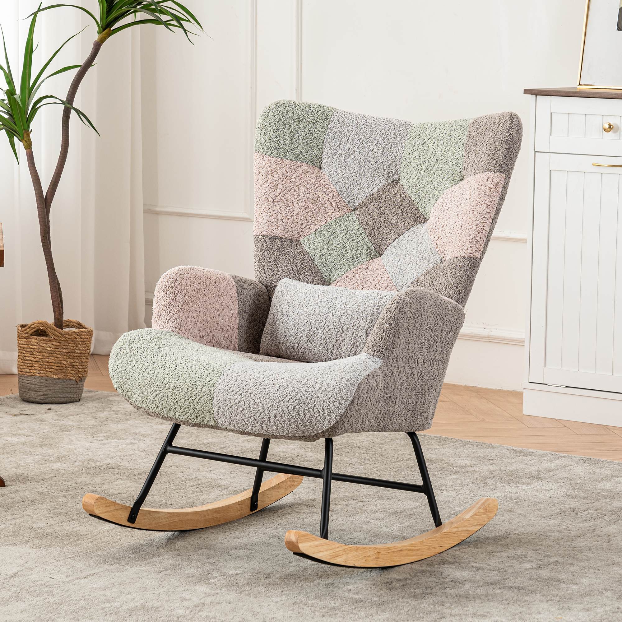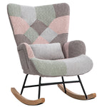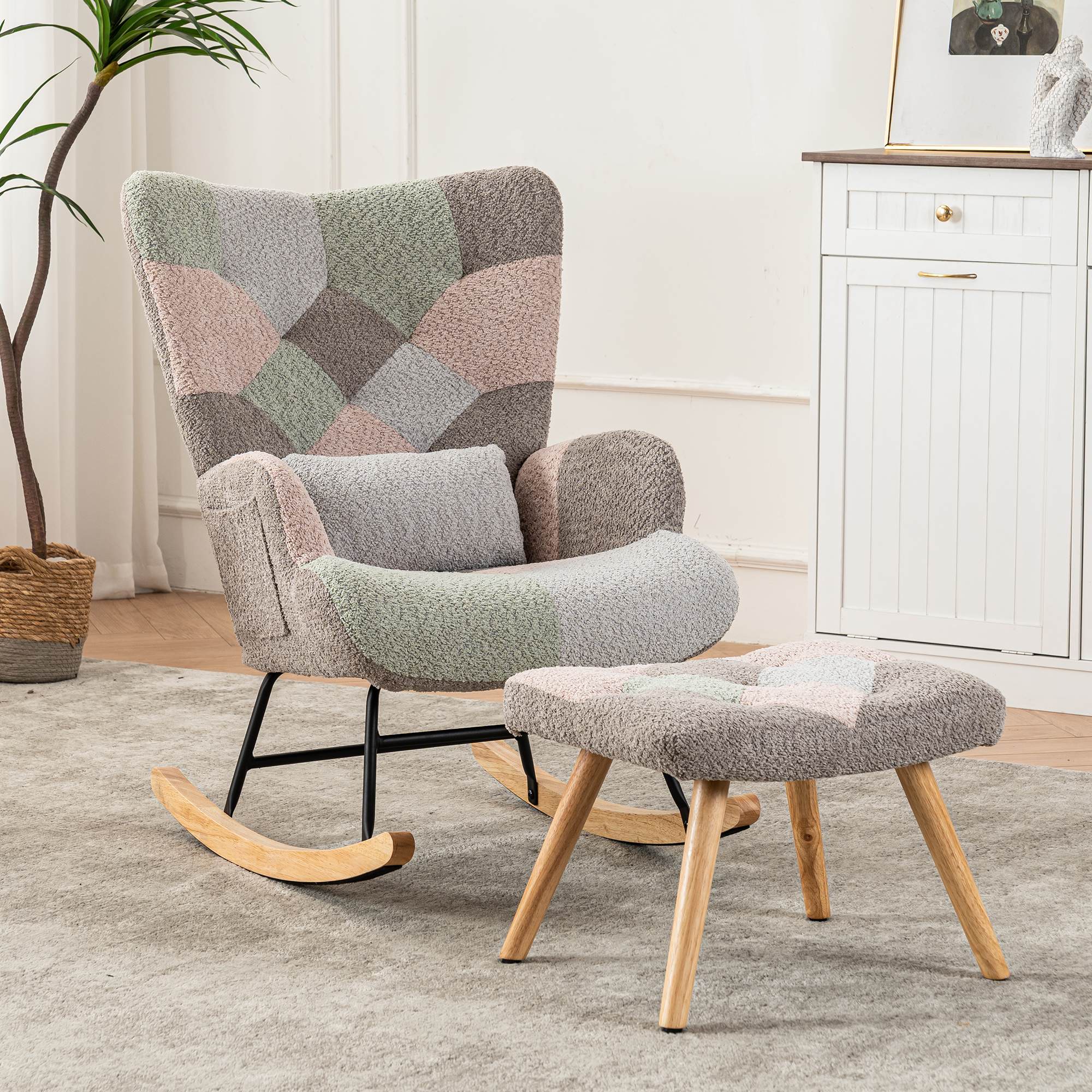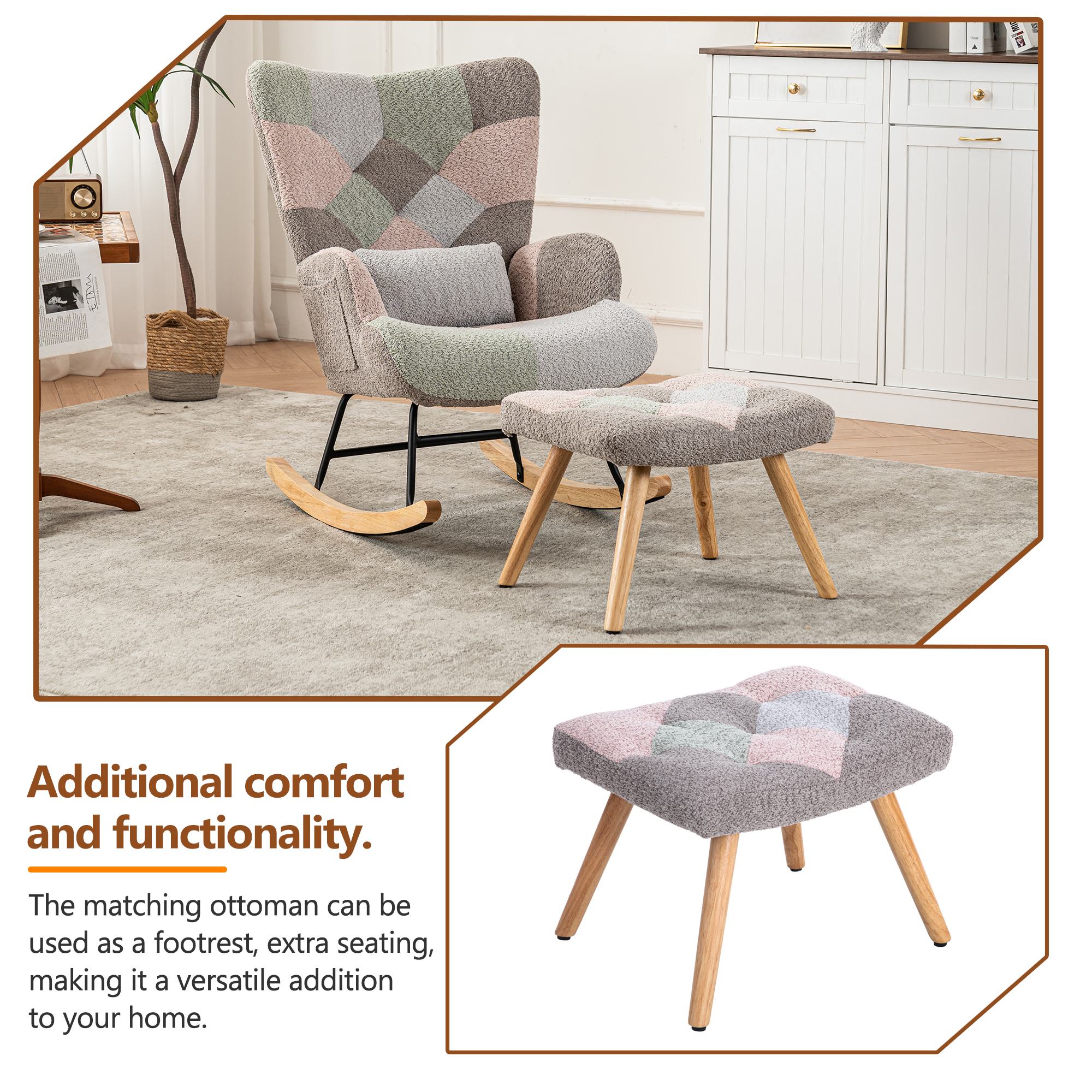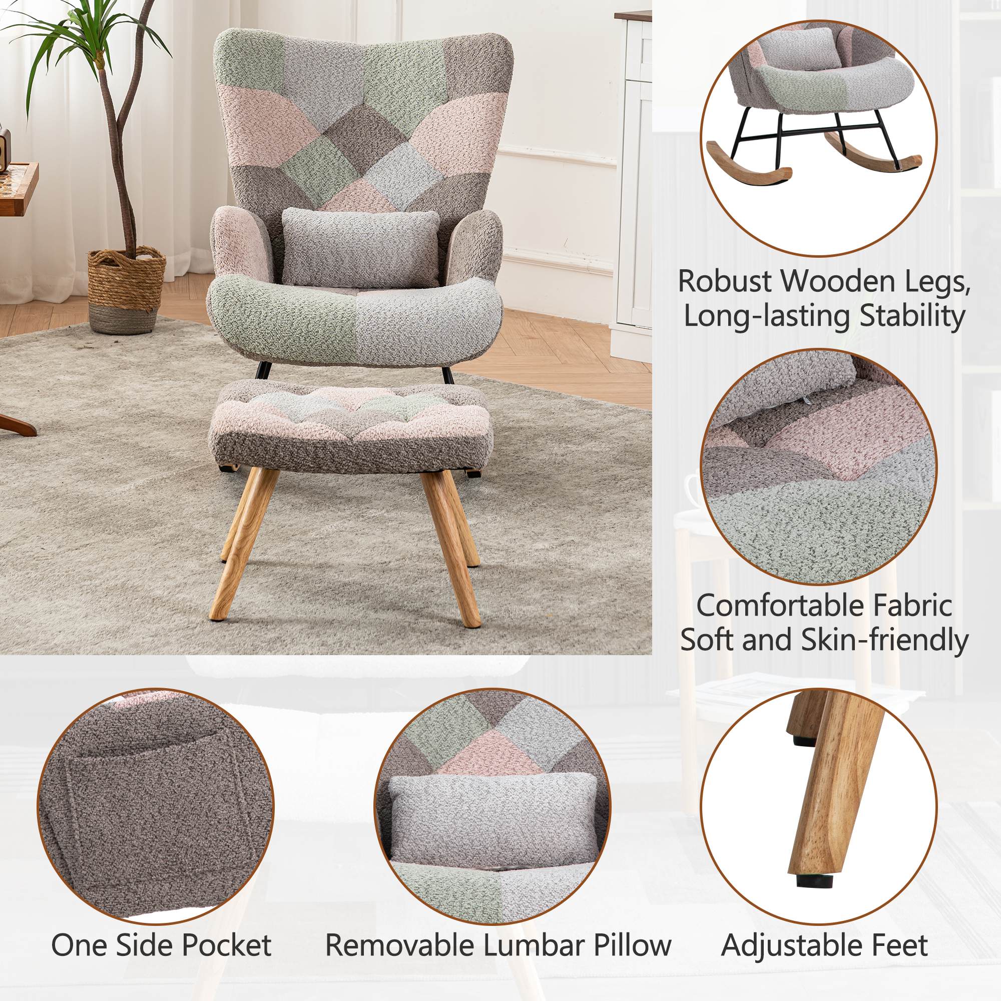 Elevate your living space with this stylish and comfortable rocking chair, featuring a vibrant multicolour patchwork design. Crafted with an iron frame, solid wood legs, and soft fabric, this chair ensures both durability and comfort, supporting up to 115 kg. The included footstool and lumbar pillow enhance relaxation, while the ergonomic wingback and armrests provide optimal seating posture. With a handy side pocket, adjustable feet, and felt pads for quieter use, this chair is a perfect blend of functionality and aesthetic appeal for any room.