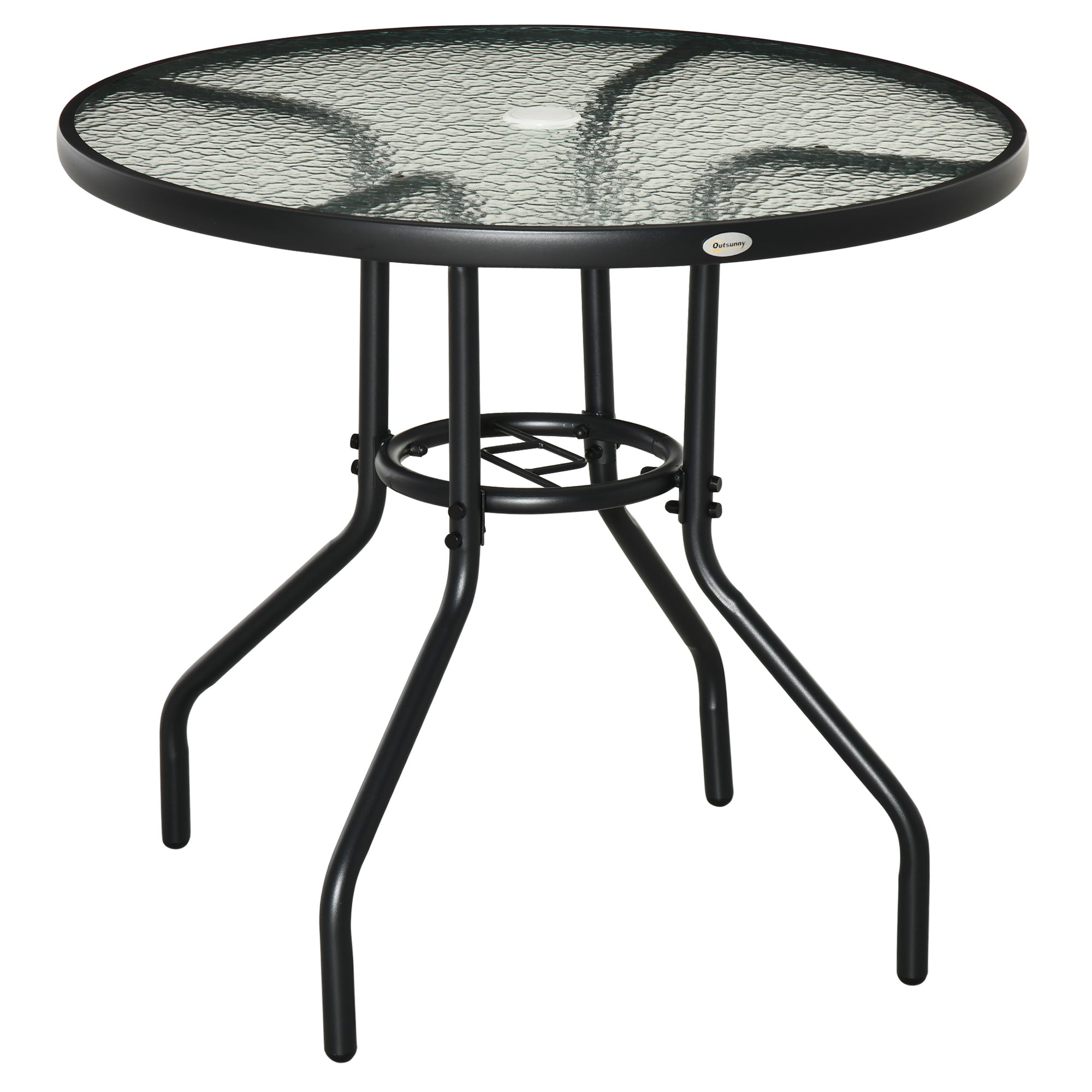 Look to this bistro table for a stylish addition to your garden and outdoor dining area. Made from powder coated steel for strength and durability, the tempered glass top adds a beautiful touch thats easy to clean and maintain. In the centre, the parasol hole allows you to put up a sun umbrella if you wish and it is kept steady with the four robust and sturdy legs. Simply add some chairs for the perfect early morning coffee and breakfast spot.
