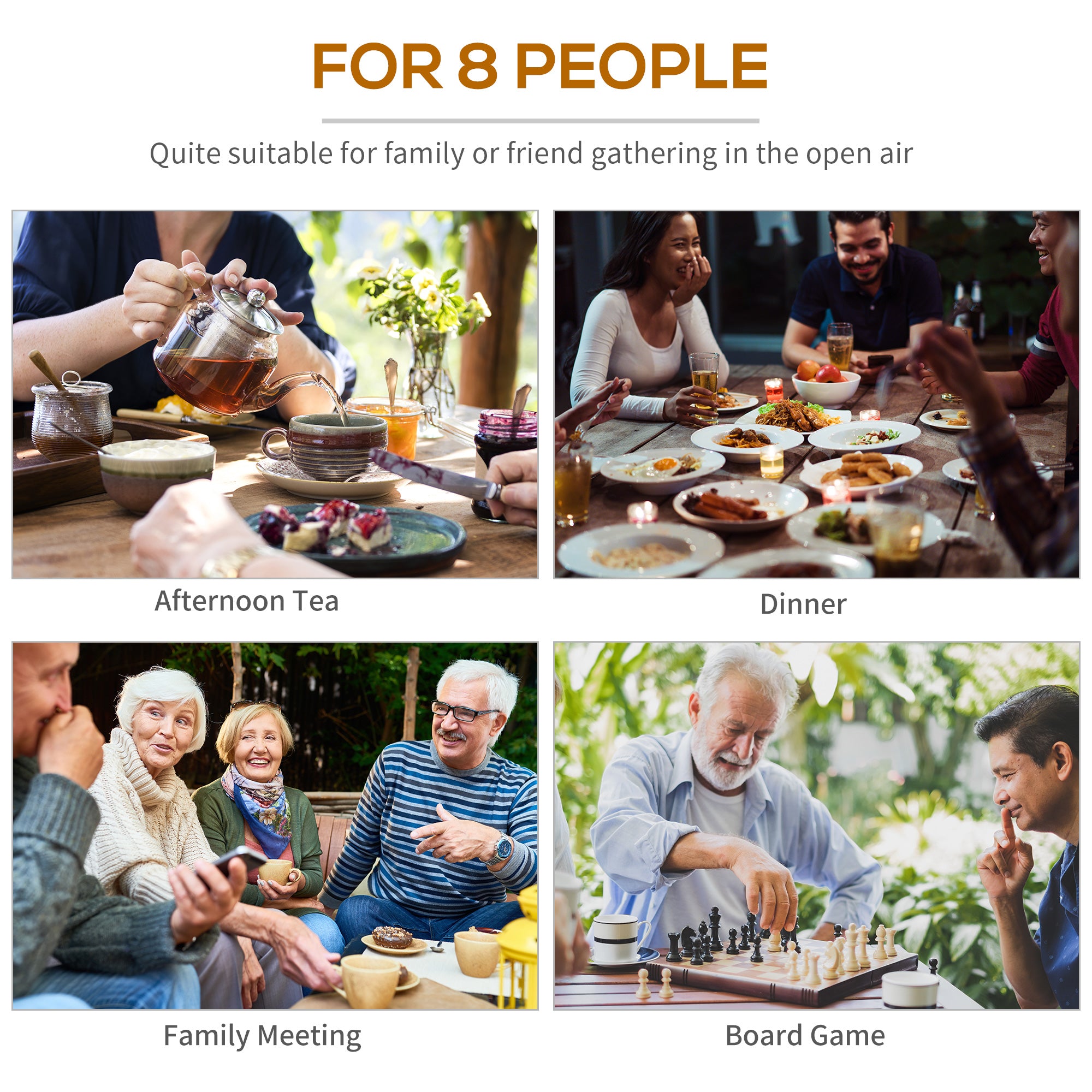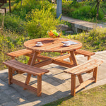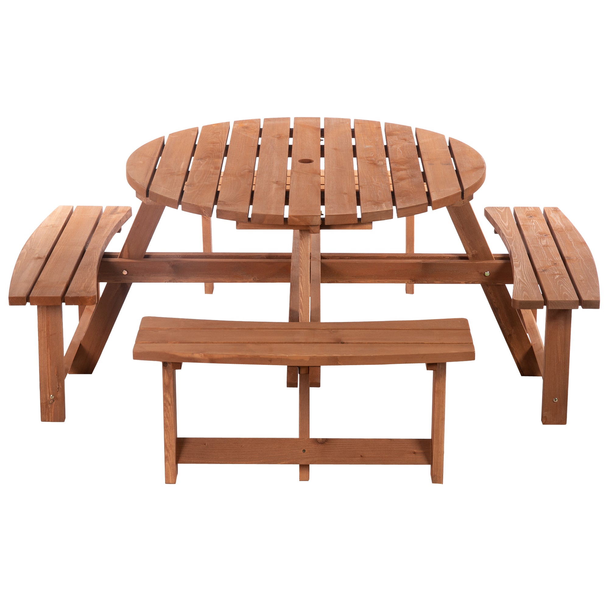 This wooden bench set is an ideal addition to any outdoor setting offering the ability to accommodate up to 8 people. Circular design gives ample room for comfortable movement and enjoy the space. A precision cut hole in the middle for parasol enabling the shade options in summer time Fir wood construction for added strength and stability with smooth edges and weight capacity of 227 kg for table and 227 kg for bench.