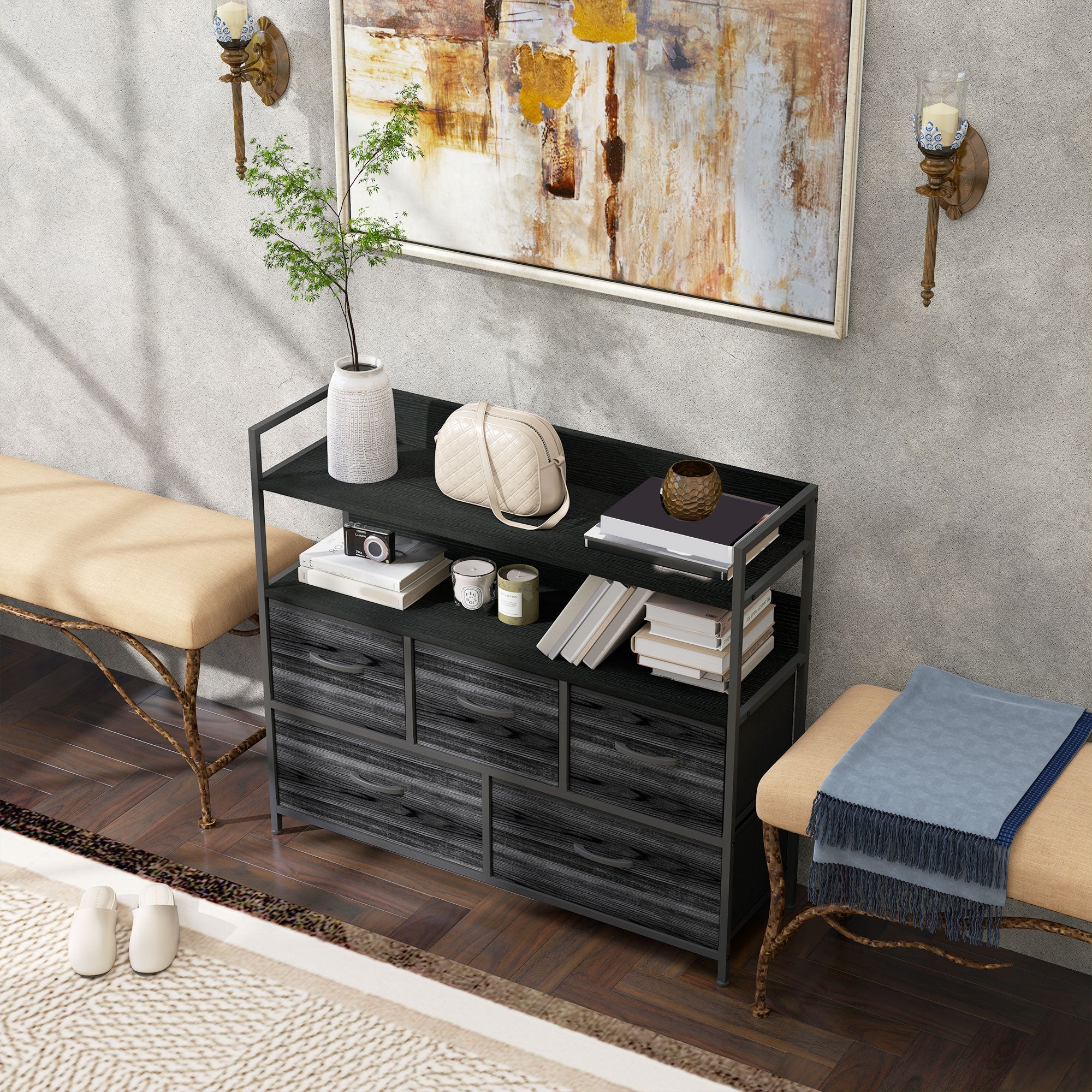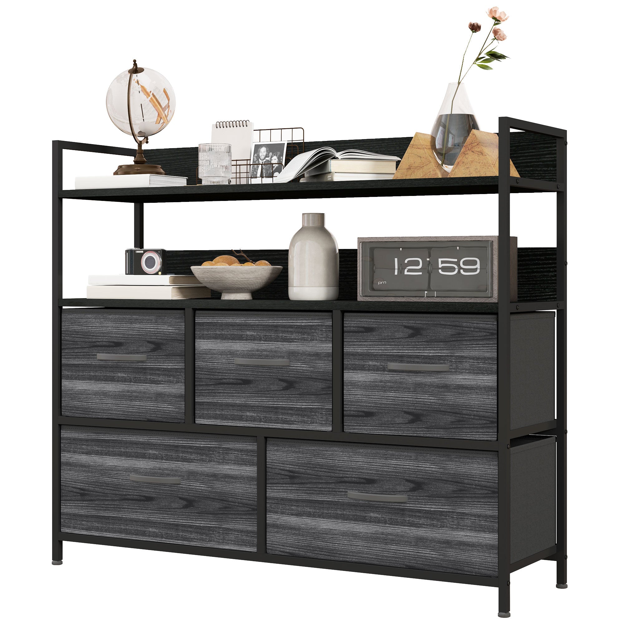 A spacious and simple approach to clothes storage, with this chest of drawers. It comes in industrial and rustic wood-effect design, a minimal and versatile look: it's great for plenty of different interior styles. This dresser comes with five drawers for storing and organising various garments. A powder coated steel frame for a strong core, finished with adjustable feet for balance.