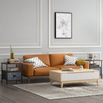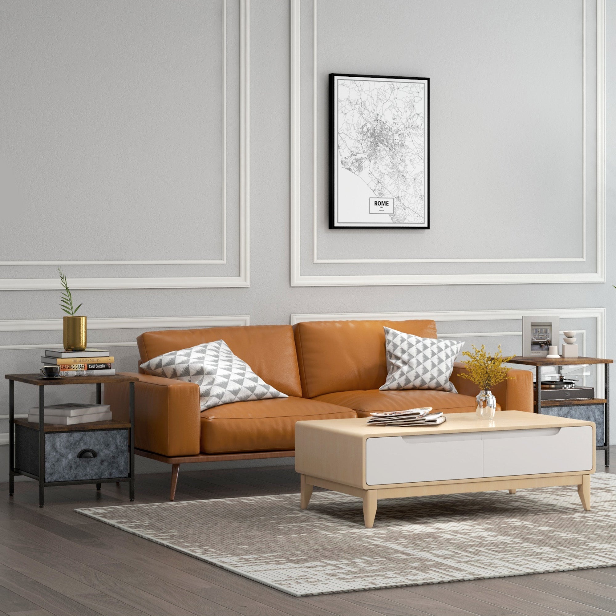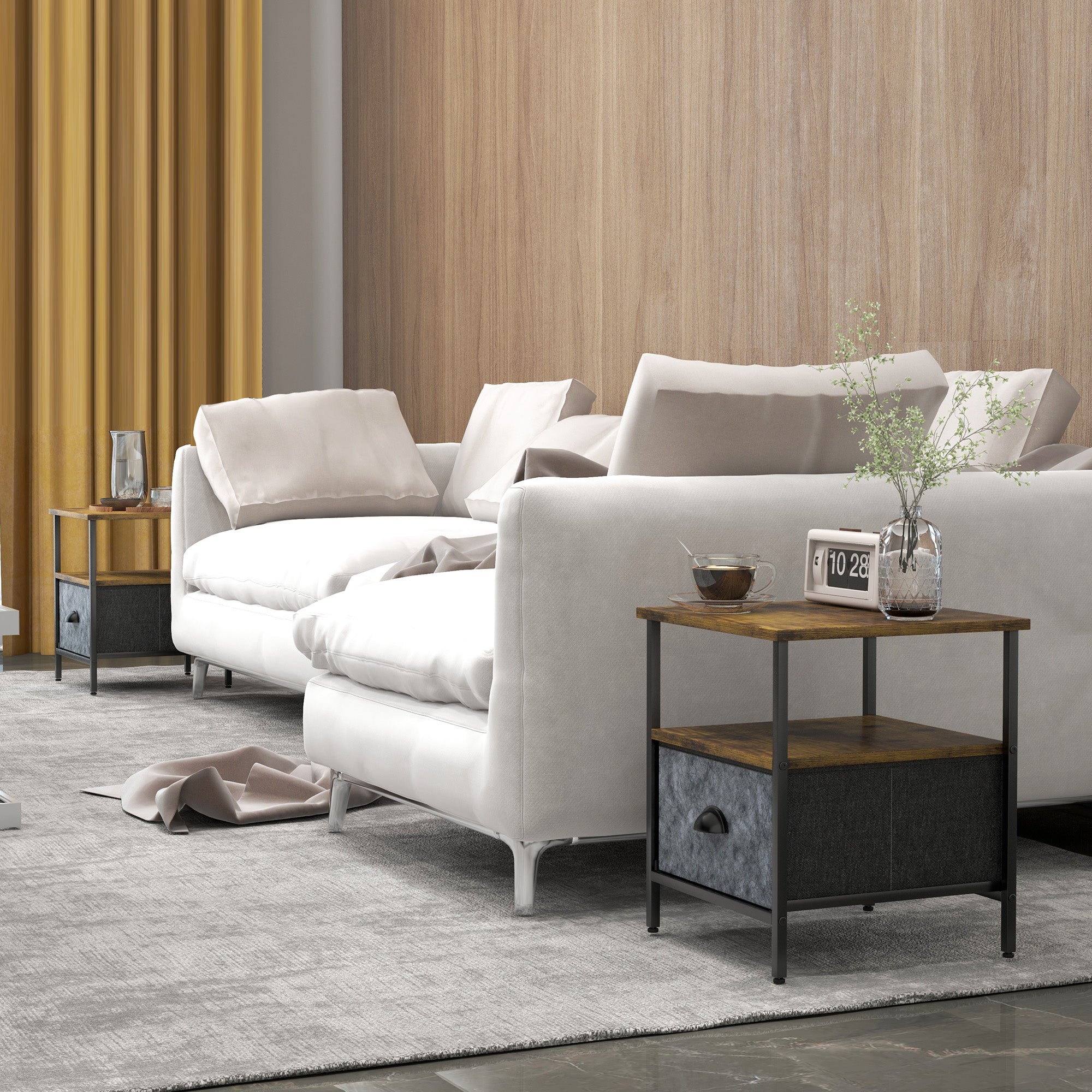 Industrial-style just stepped up: this set of 2 side table. A two-tone dark wood-effect design, paired with the matte black frame and grey drawer creates a striking and stand-out look, for a point of difference in the home. Comes with a bottom fabric drawers, an open shelf and a table top - plenty of handy storage space. The frame, made from metal, is robust, with adjustable feet to finish, so it always keeps balanced. Why not use as a bedside table?
