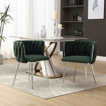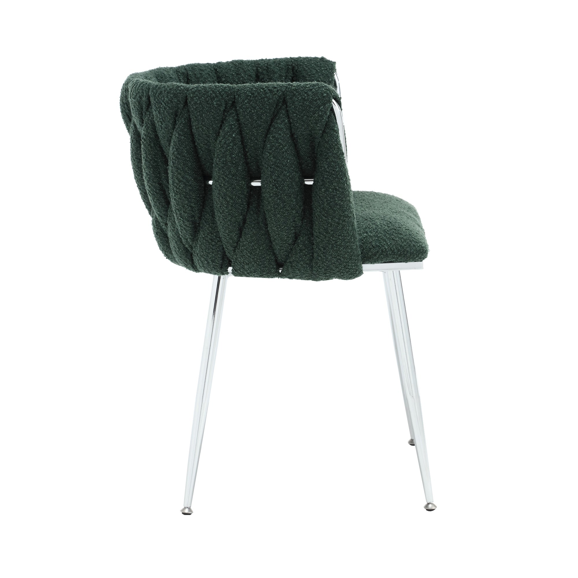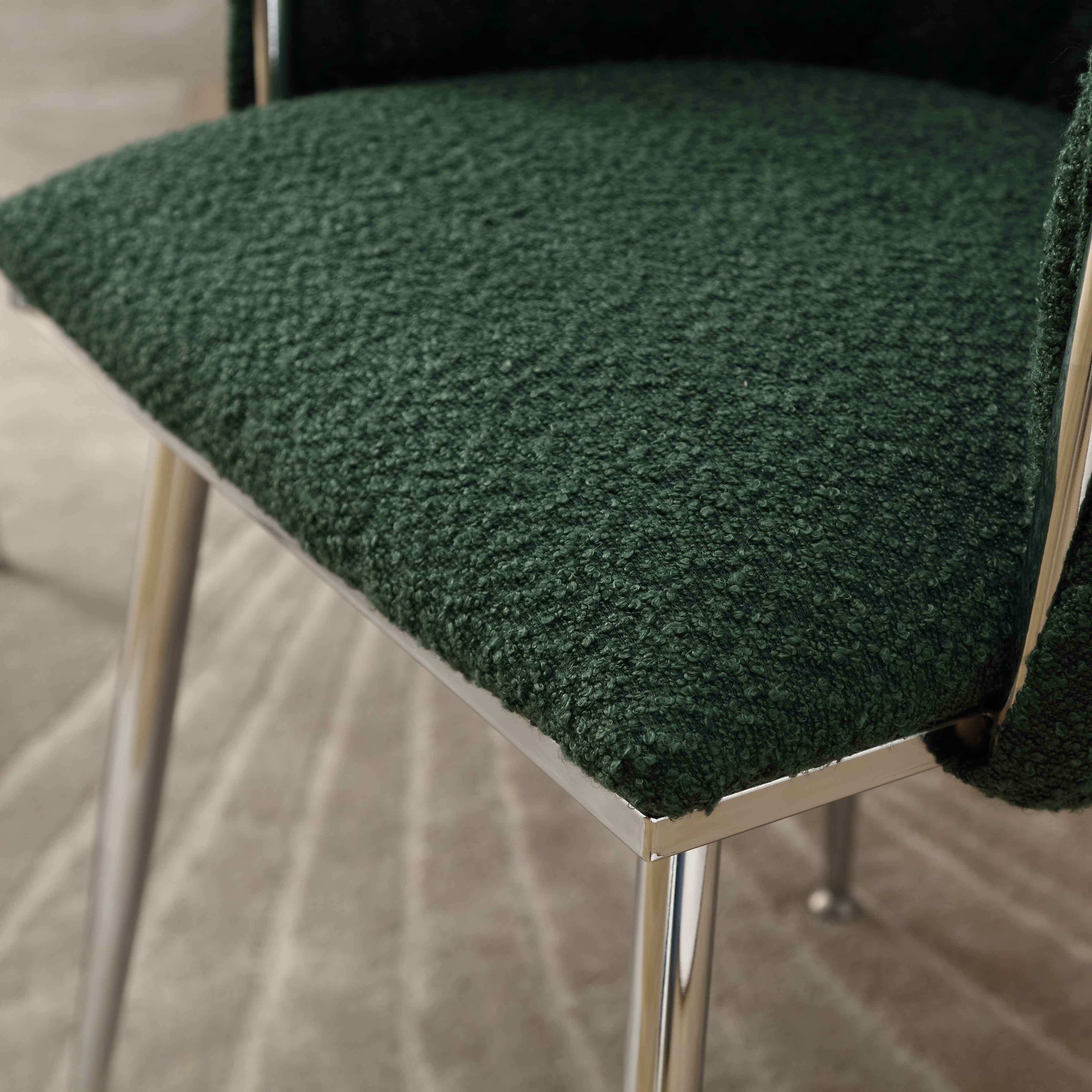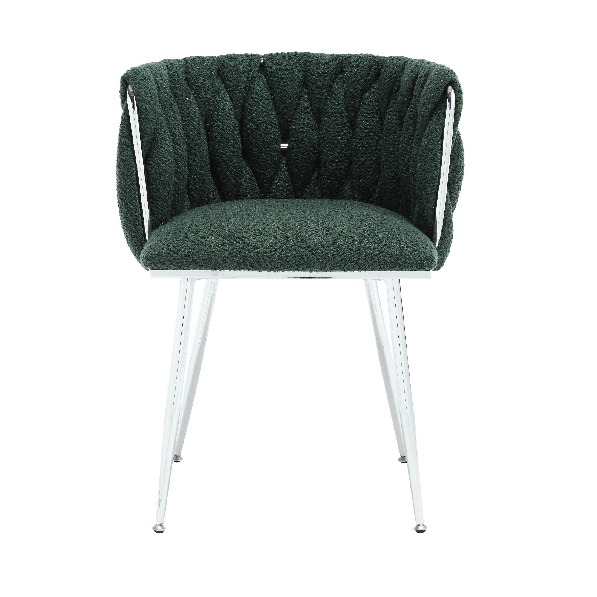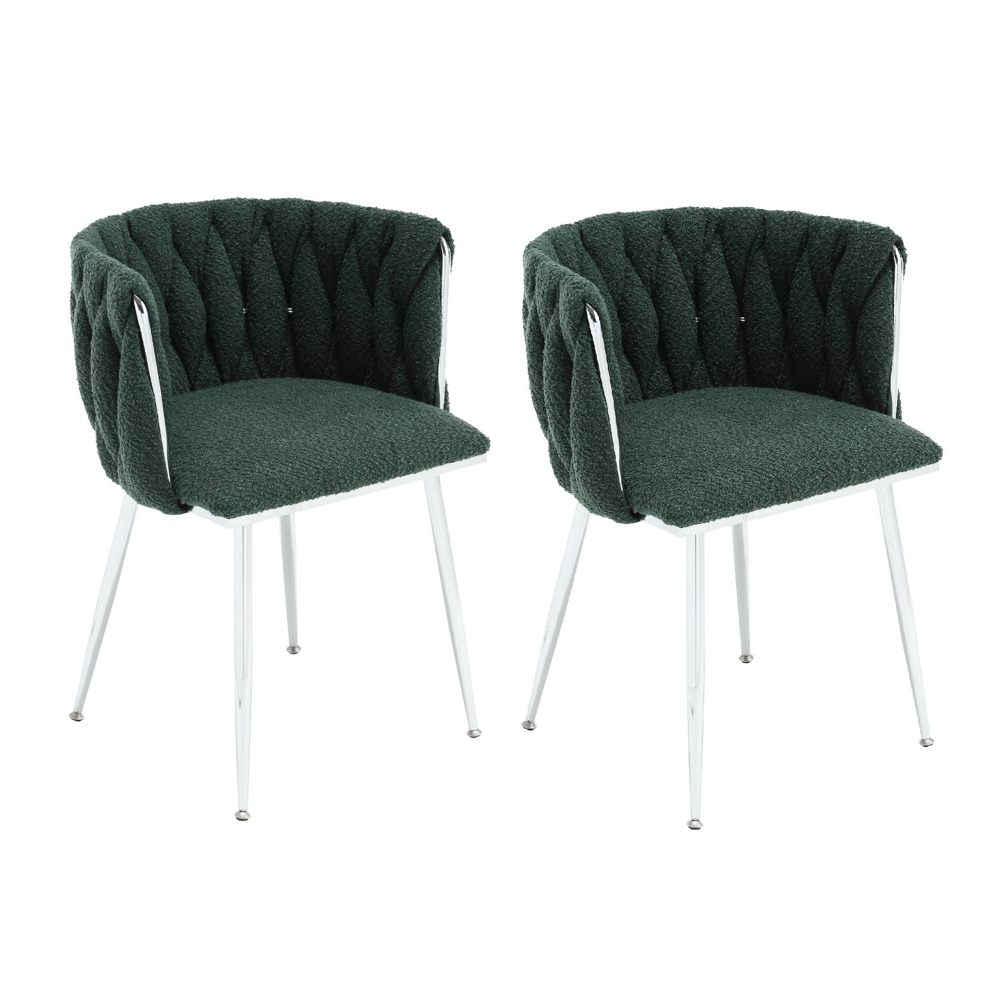 Set of 2 Modern Dining Chairs with Silver Legs, Hand-woven Backrest and Armrests, Upholstered Boucle Armchair for Living Room, 54x52x73 cm, Emerald
