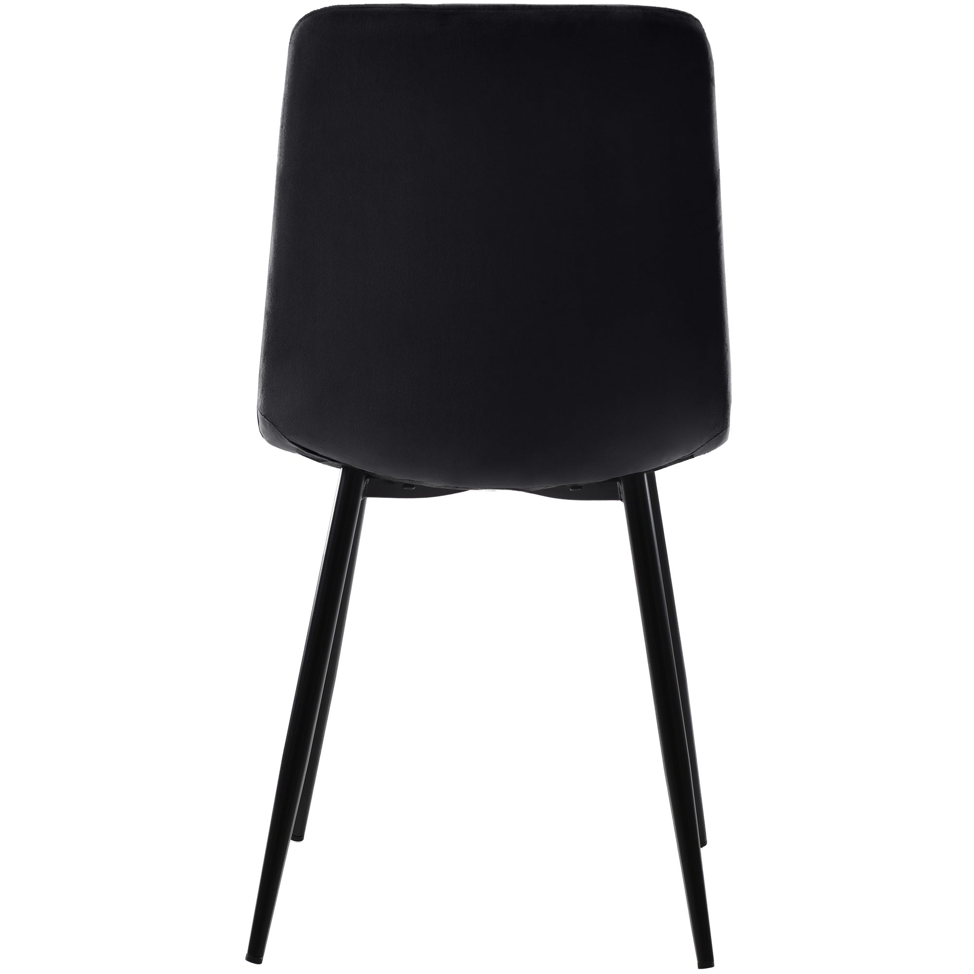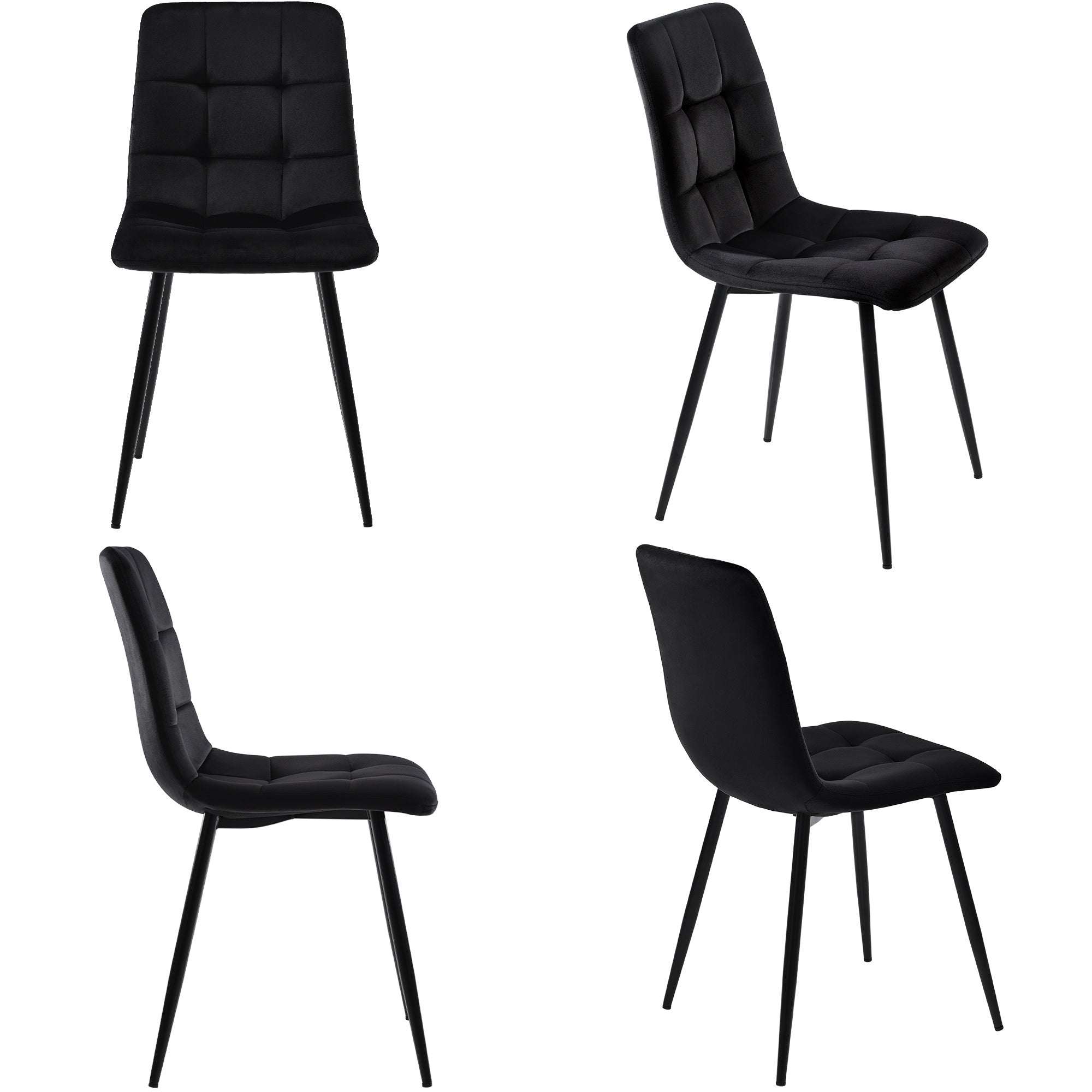 Enhance your dining experience with this set of four black upholstered dining chairs. Featuring a durable velvet surface, high-density foam padding, and sturdy metal legs, these chairs offer both comfort and longevity. The ergonomic design, complete with decorative quilting, ensures a pleasant sitting sensation, while scratch-resistant floor protectors keep your floors pristine. Easy to assemble with included instructions, these versatile chairs are perfect for any room, from the dining area to the home office.