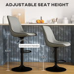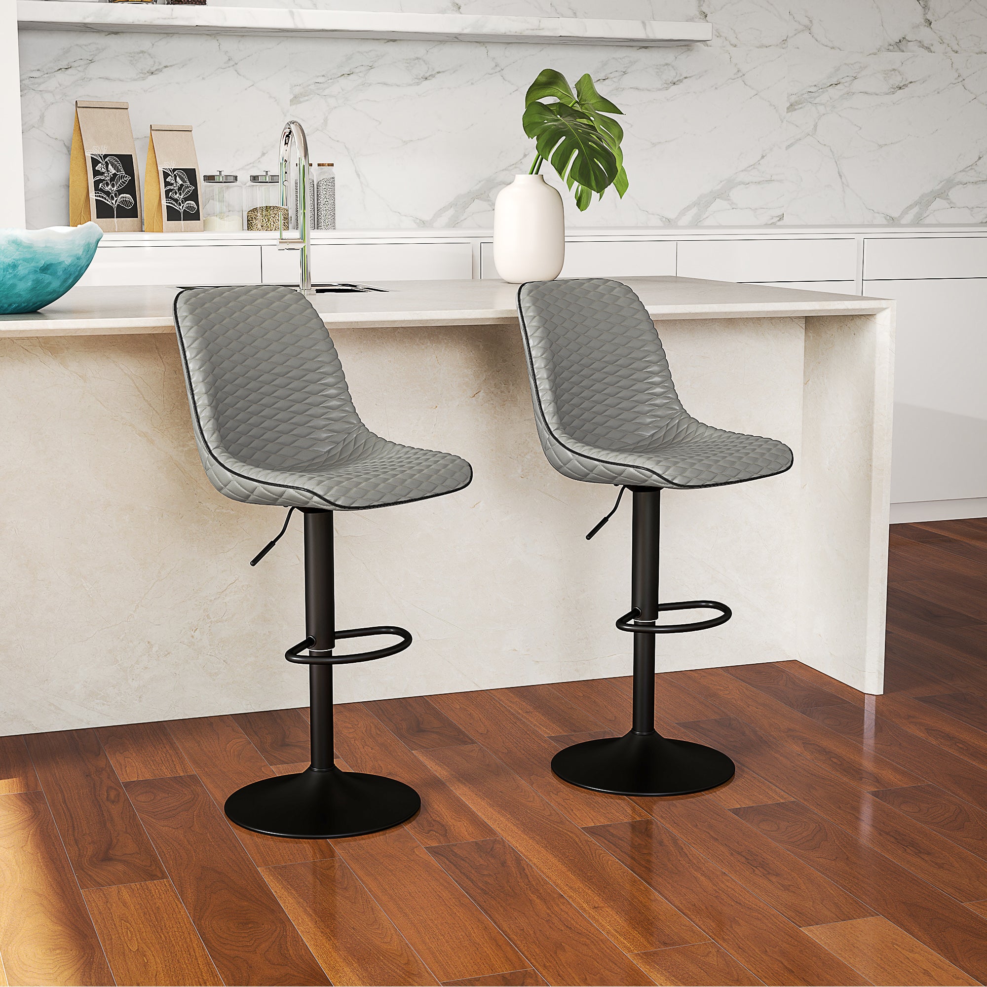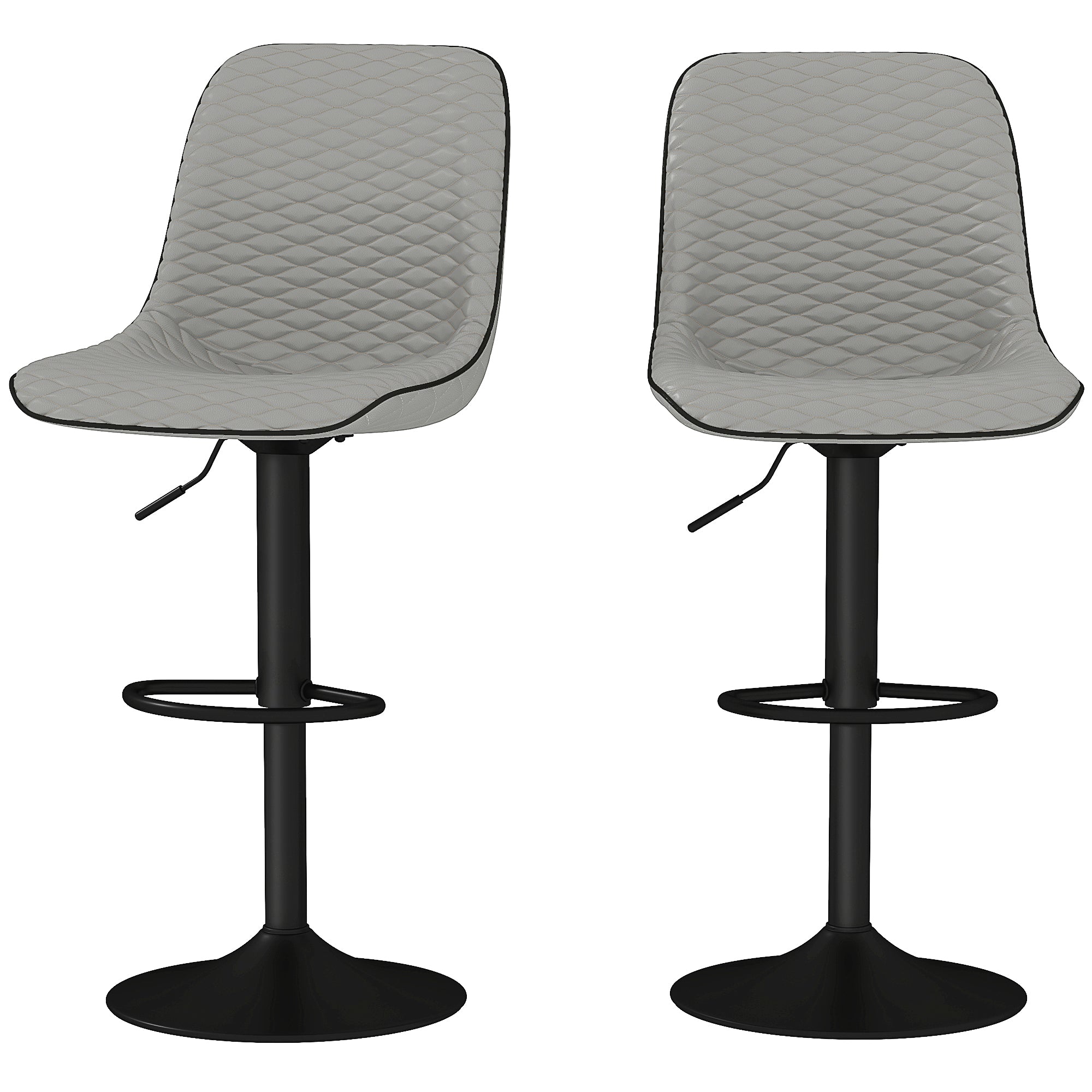 A stylish look for your kitchen and dining spots with these faux leather bar stools. The backs and seats feature a diamond tufted pattern for a touch of style. Sponge padded bar stool for comfort, upholstered in faux leather for a smooth and stylish touch. The metal base on each swivel bar stool offers strong support, complete with a lower footrest.