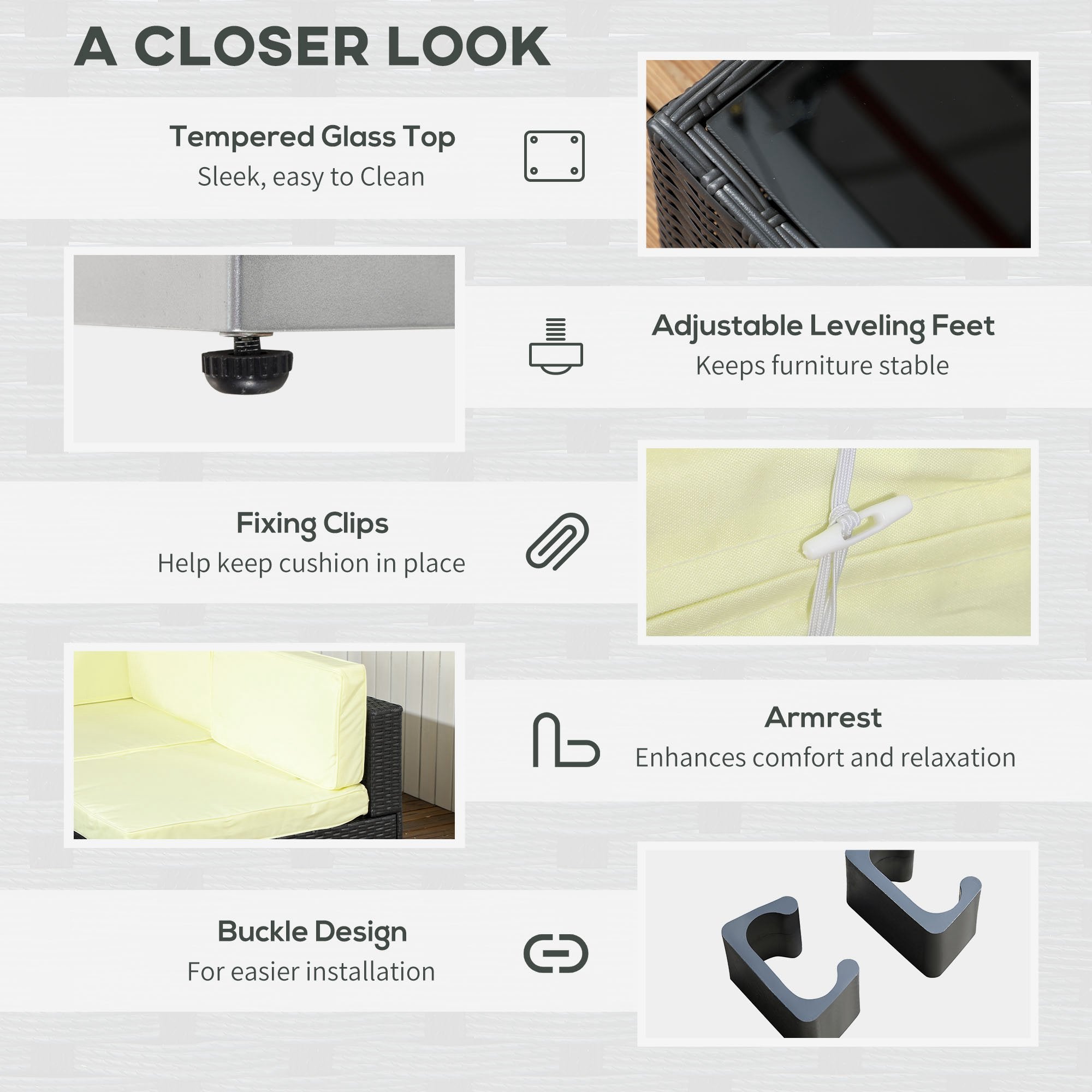 Bring beauty and comfort into your garden with patio set. The steel frame of each piece means a strong, supportive structure; wrapped in PE wicker, the rattan top offers extra protection and style. Padded seat and back cushions provide comfort, with two extra pillows included. The rattan corner sofa is easy to assemble, with the buckle fastenings keeping all pieces secure. Set is completed with a safe tempered glass top on the table for a sleek look.