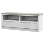 A compact and comfortable shoe storage with seat,. Keep this shoe storage cabinet in your hallway for convenience when leaving and entering the house. Comes with two open compartments and two drawers; each open compartment holds roughly five pairs of shoes. A padded seat on the top so you can sit down comfortably when putting shoes on and taking them off.
