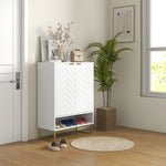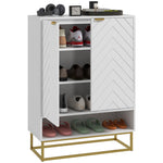 Footwear organisation with a touch of character - go for this shoe cabinet. It comes with chevron patterns on the front for something different, with the gold-coloured base adding some elegance. Inside there are three shelves: one is adjustable to fit different sized footwear. Holds up to 12 shoe pairs total, maximum size UK 9.5