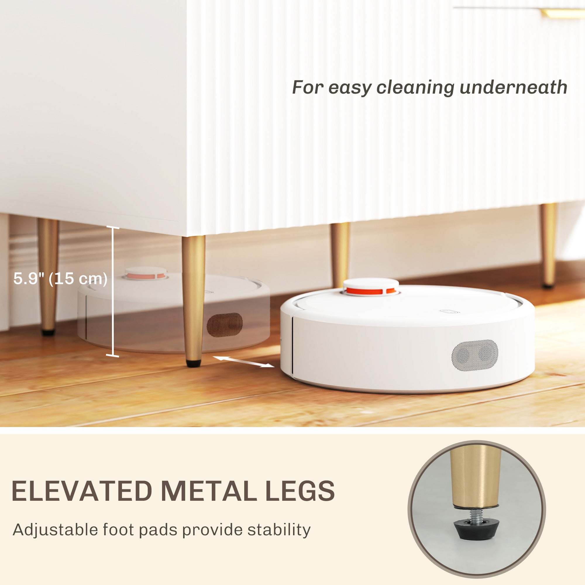 Metal legs, gold tone handles and fluted panel design give it a modern look
