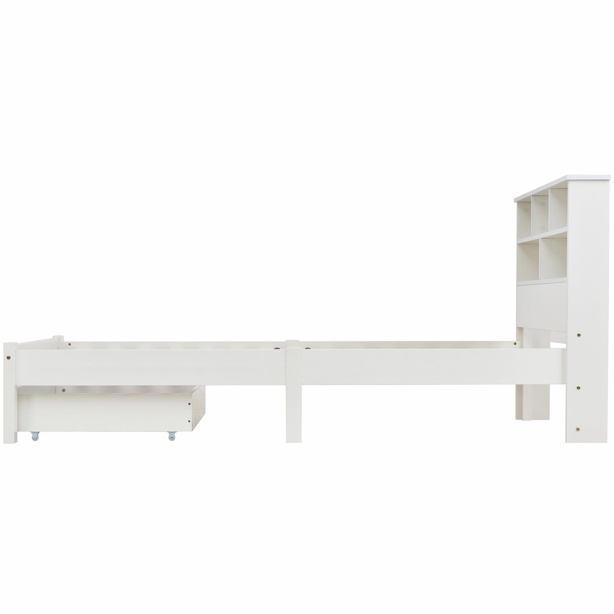 Single Wooden Storage Bed with Built-in Shelves and Underbed Drawer, Pinewood and MDF, for Adults, Kids, Teenagers, 208x100x93 cm, White