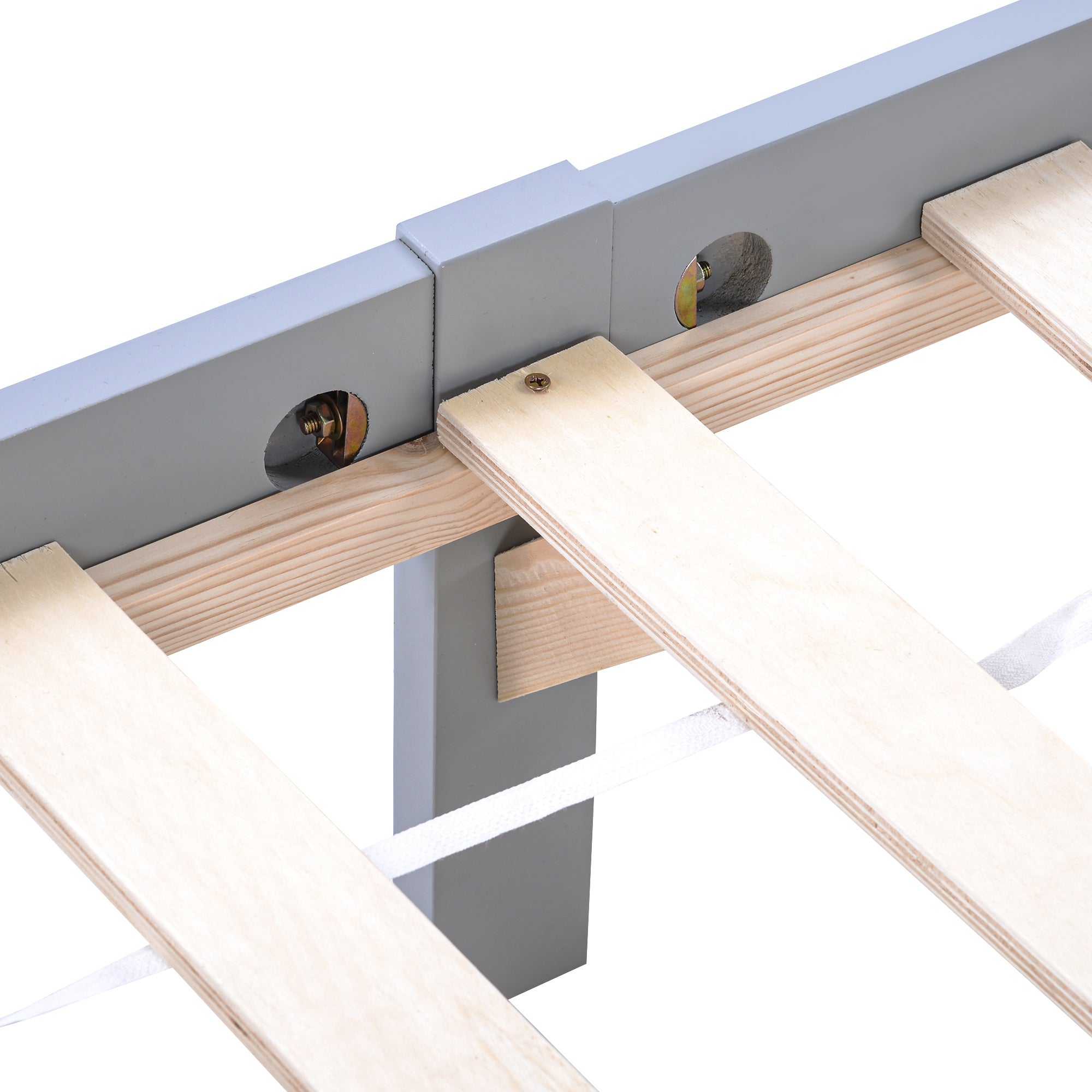 Elevate your bedroom's aesthetic with this chic and sturdy 4ft6 Double Wooden Bed Frame, crafted from premium pine wood and P2 class MDF. This elegant grey bed frame, measuring 196L x 140W x 77H cm, is designed to support a standard 135 x 190 cm mattress without the need for a box spring, thanks to its reliable wooden slats that enhance mattress longevity. The frame features a total of nine legs, including three central support legs, ensuring robust stability with a maximum weight capacity of 150 kg. Additionally, the 21 cm clearance beneath the bed provides ample storage space, while the non-toxic, environmentally friendly paint ensures safety and peace of mind.