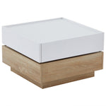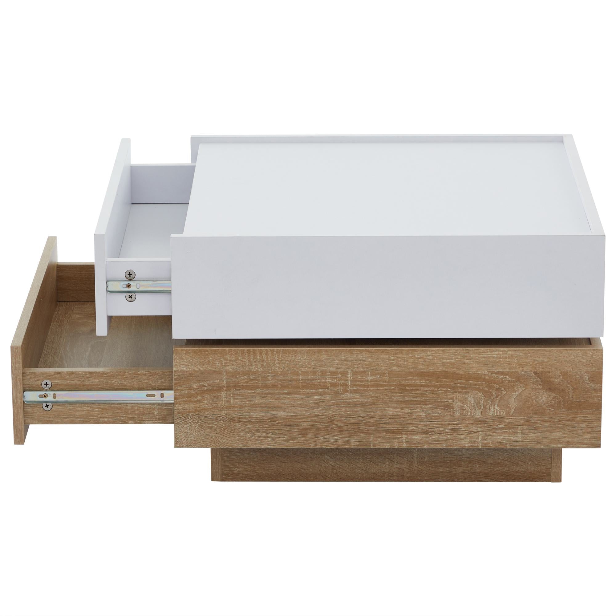Elevate your living room with this stylish square 360° rotating coffee table, featuring a sleek white and oak finish. Crafted from durable particle board, this two-tier centrepiece boasts a unique swivel tabletop that rotates 360 degrees, allowing you to customise its position for both storage and decorative purposes. With two spacious drawers and ample storage space, it offers a practical solution to keep your essentials neatly organised. Measuring 60L x 60W x 38H cm, this versatile table is perfect for any room, providing a chic and functional addition to your home Decor.