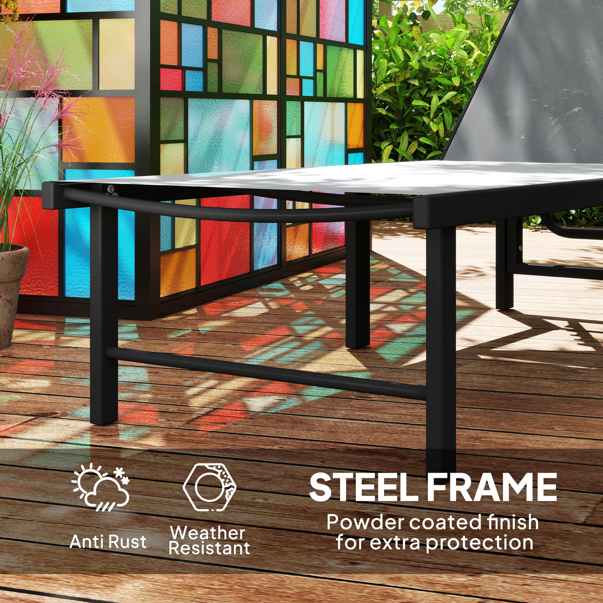 Lay the day away, your way with this garden sun lounger. The reclining sun lounger with five-level adjustable backrest can be set to different angles to a position you want. Powder coated steel frames are strong to support you as you relax. Cool off on hot days with the breathable texteline on the outdoor sun lounger. So, sit down, sunbathe, take a nap and enjoy peace and comfort with this flat sun lounger!