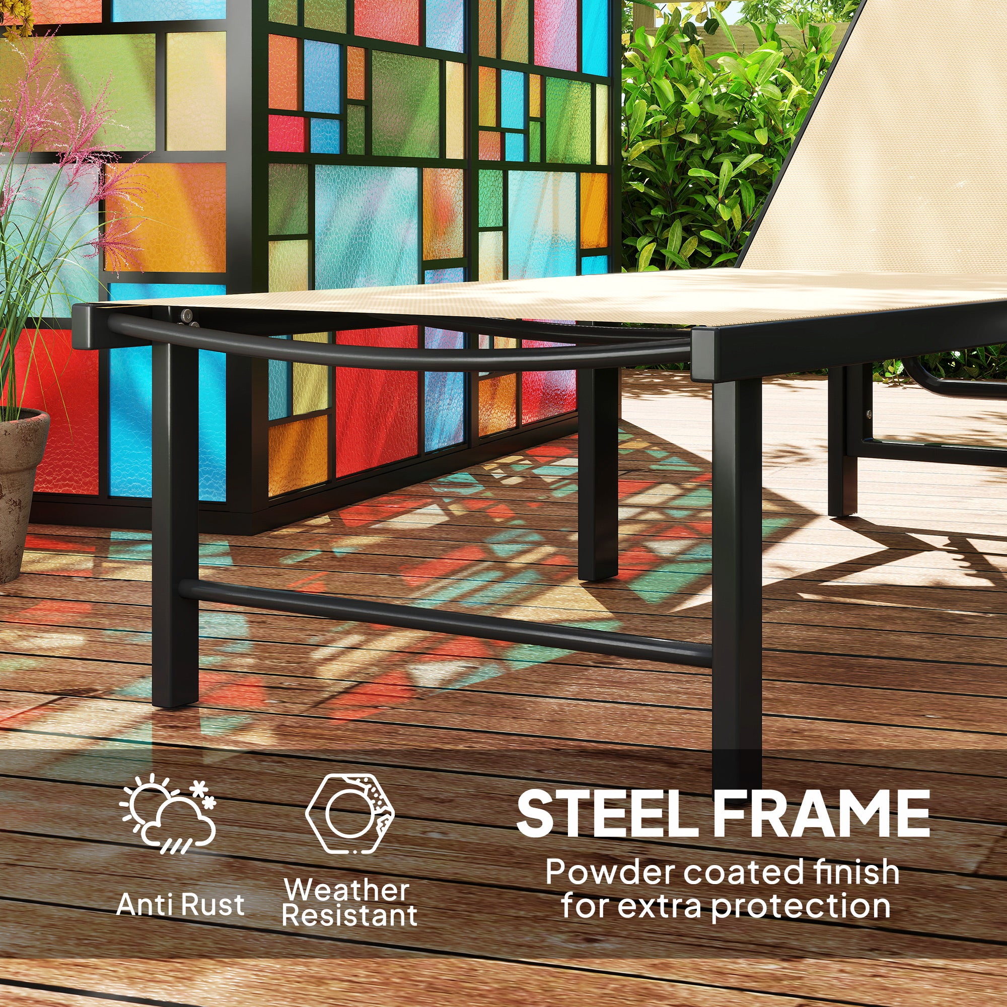Lay the day away, your way with this garden sun lounger. The reclining sun lounger with five-level adjustable backrest can be set to different angles to a position you want. Powder coated steel frames are strong to support you as you relax. Cool off on hot days with the breathable texteline on the outdoor sun lounger. So, sit down, sunbathe, take a nap and enjoy peace and comfort with this flat sun lounger!