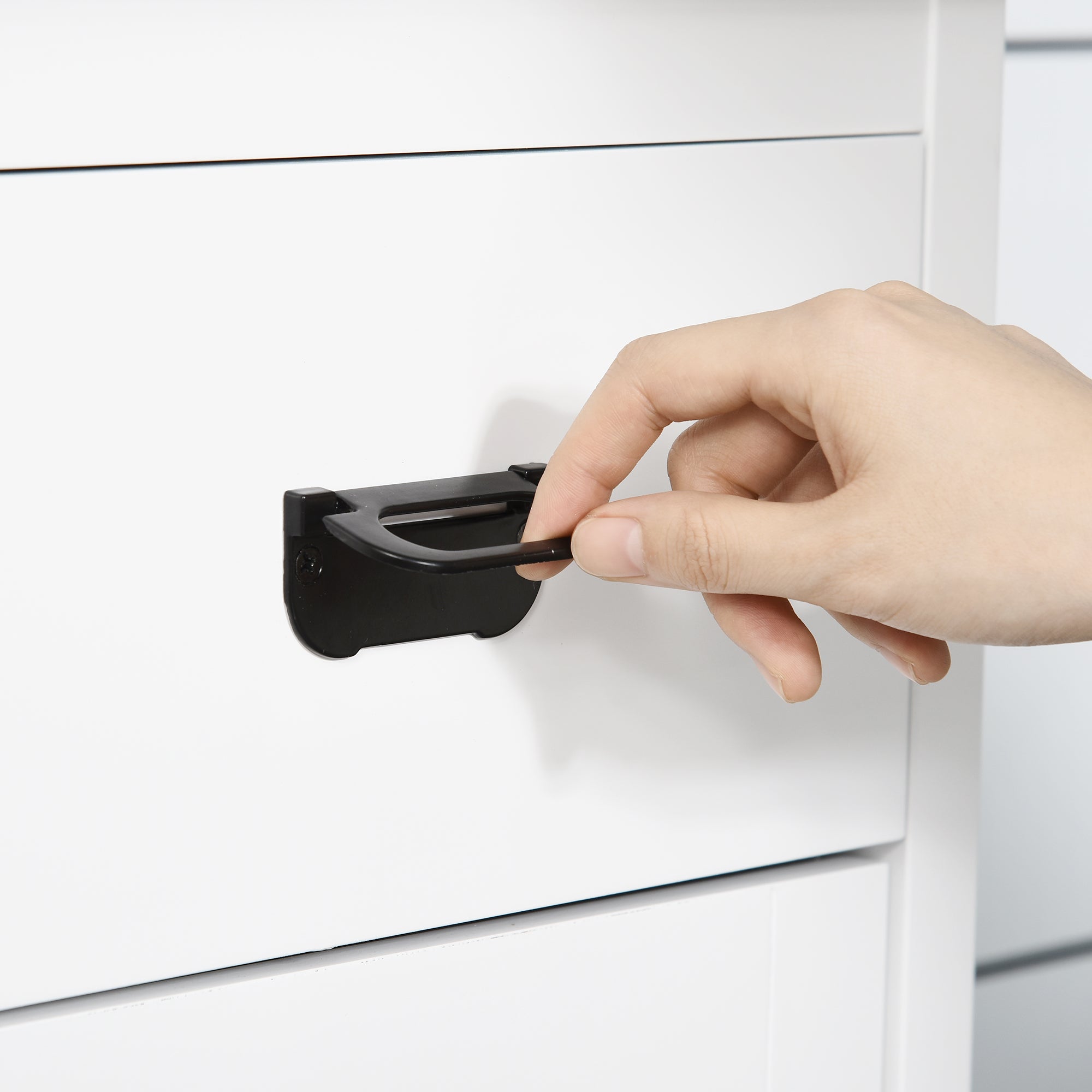 Modern tallboy design, in a fresh white finish with black accents. Small feet to elevate
