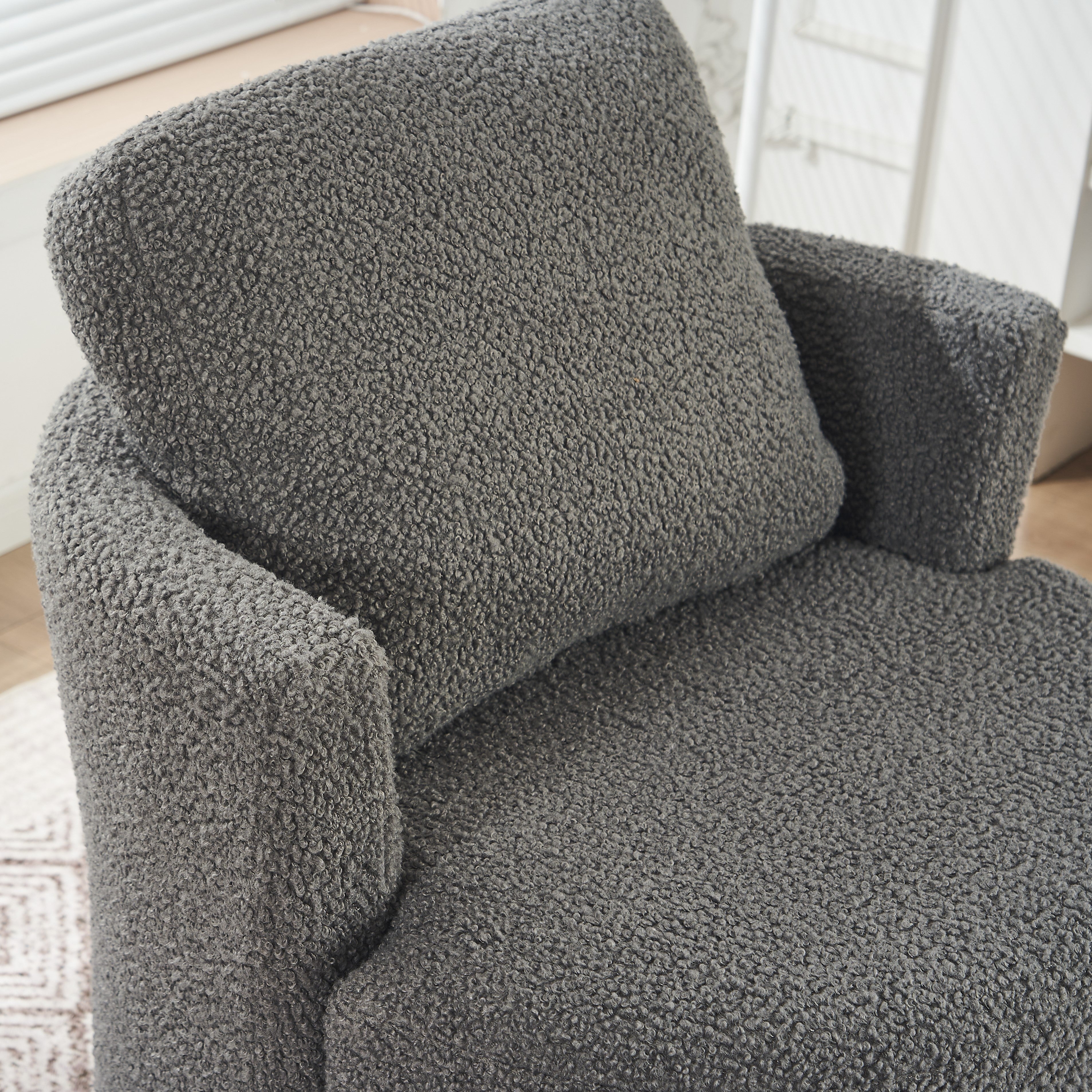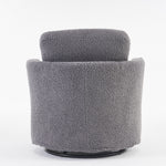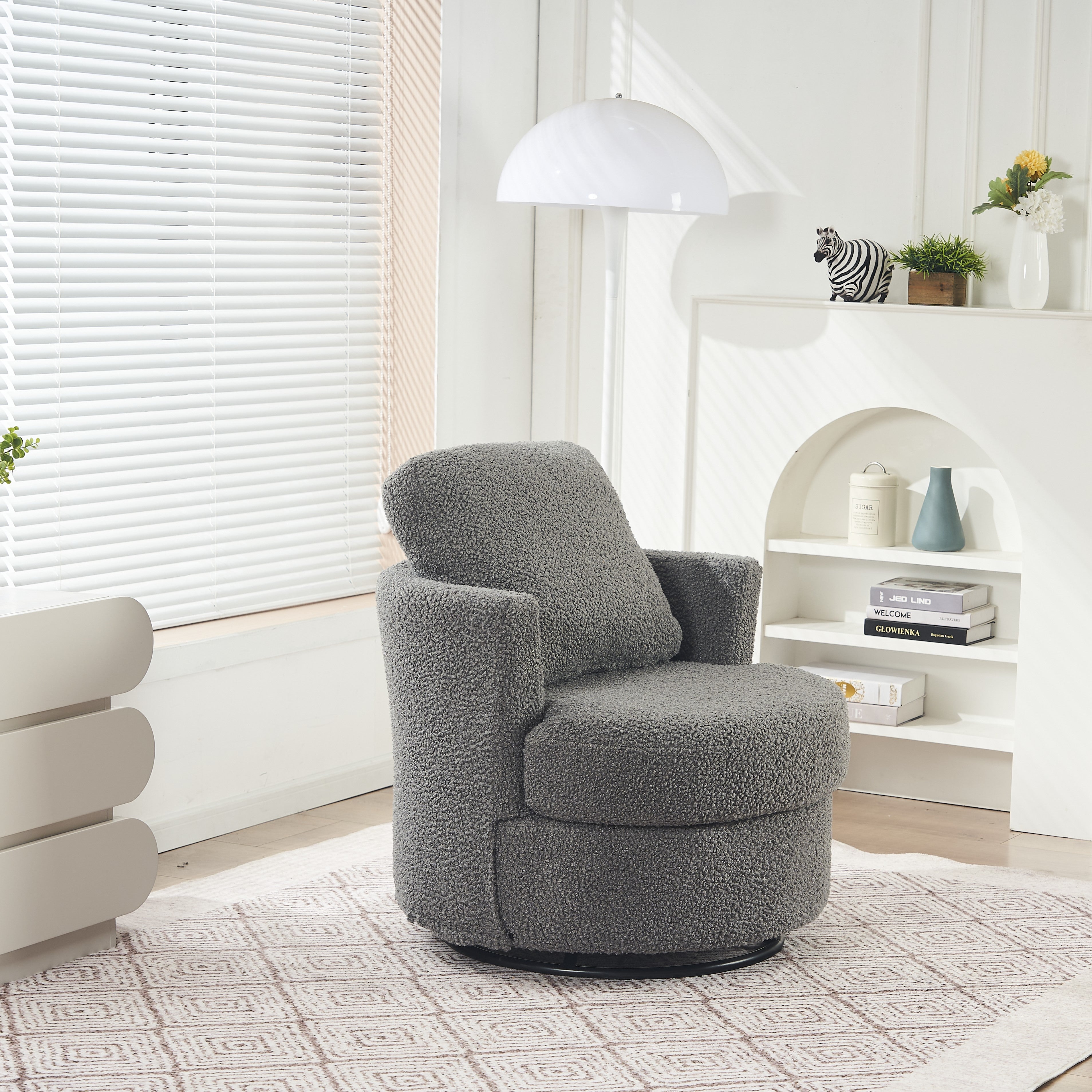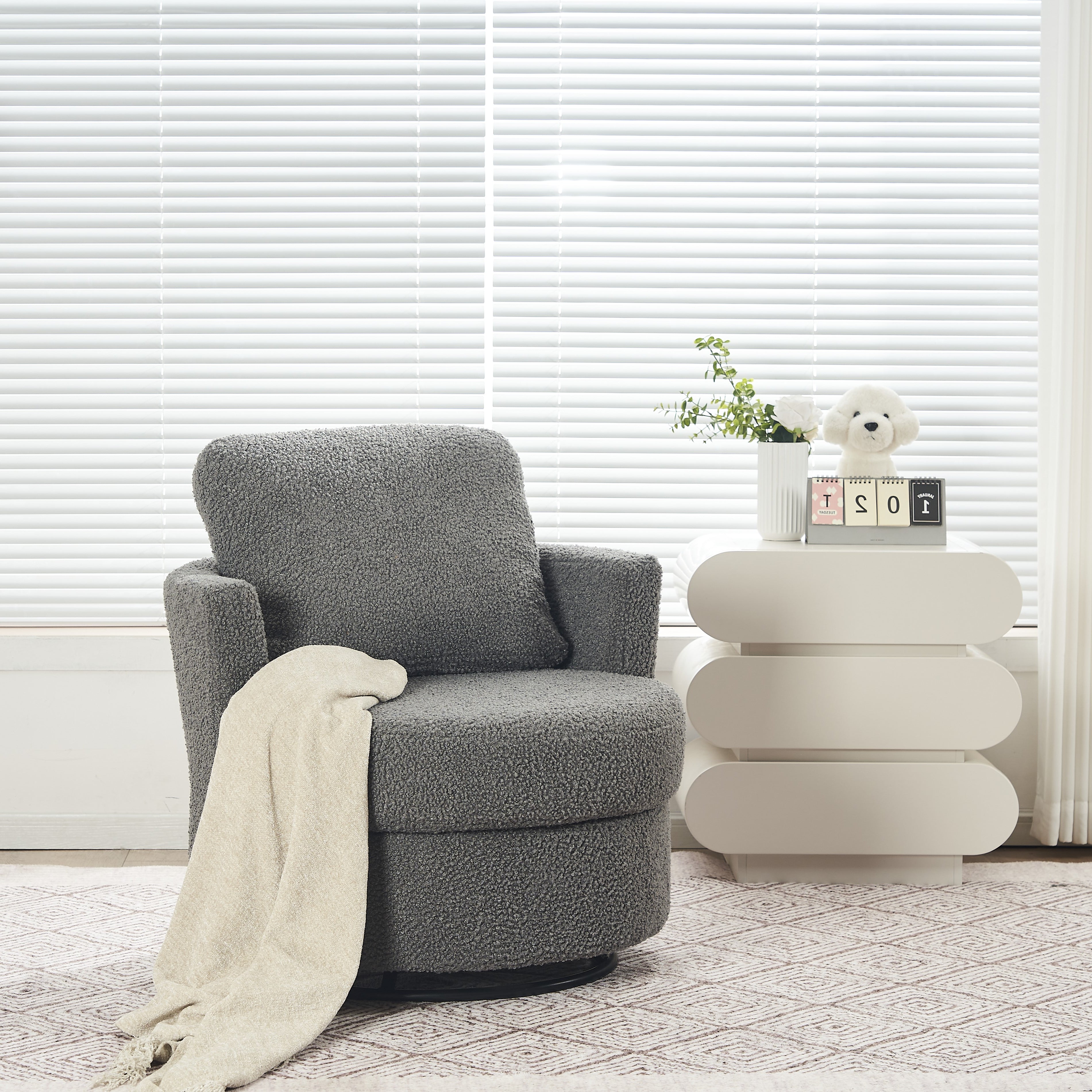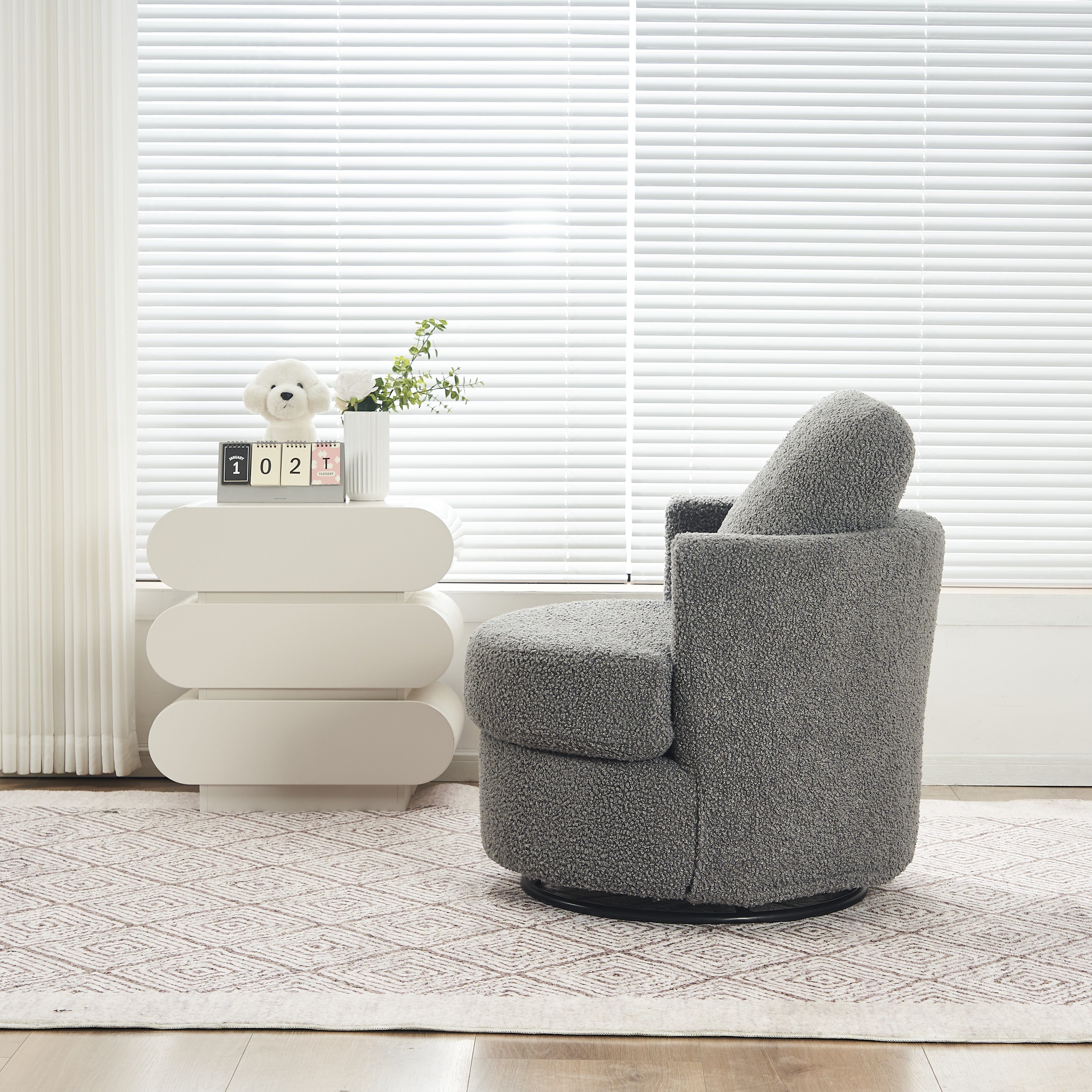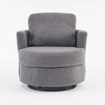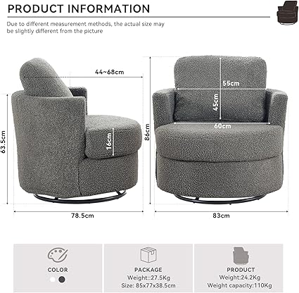 Experience ultimate comfort with the Teddy swivel armchair, featuring a back cushion pillow and thick foam pad in a stylish medium grey. Crafted from soft Teddy fabric, this chair is supported by a sturdy wooden frame and a black round swivel base, allowing for 360° rotation. Measuring 78.5L x 83W x 86H cm when assembled, it is perfect for any indoor space, including living rooms, bedrooms, and coffee shops. Easy to assemble in just 5 minutes, this chair supports up to 110kg and is easy to maintain with spot cleaning.