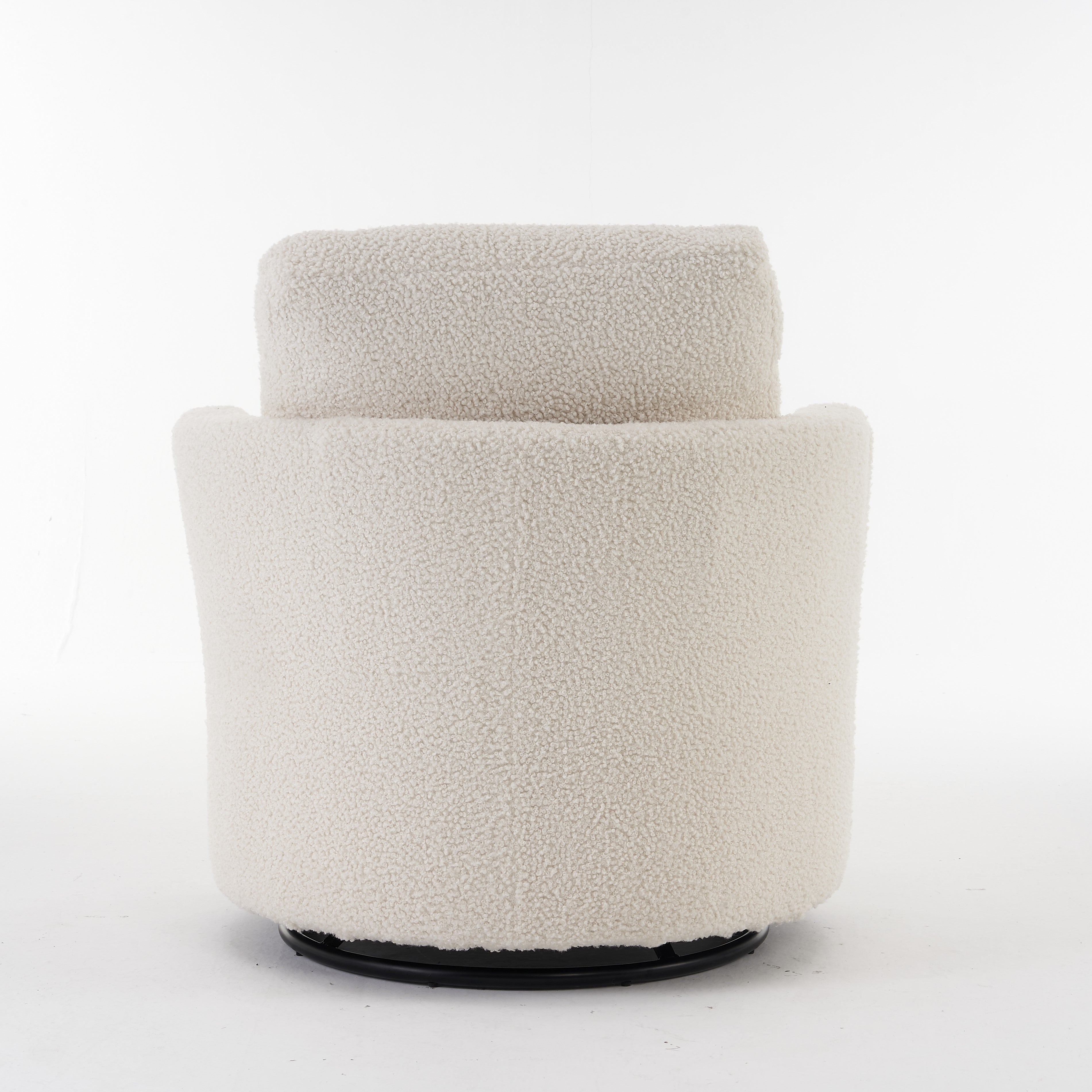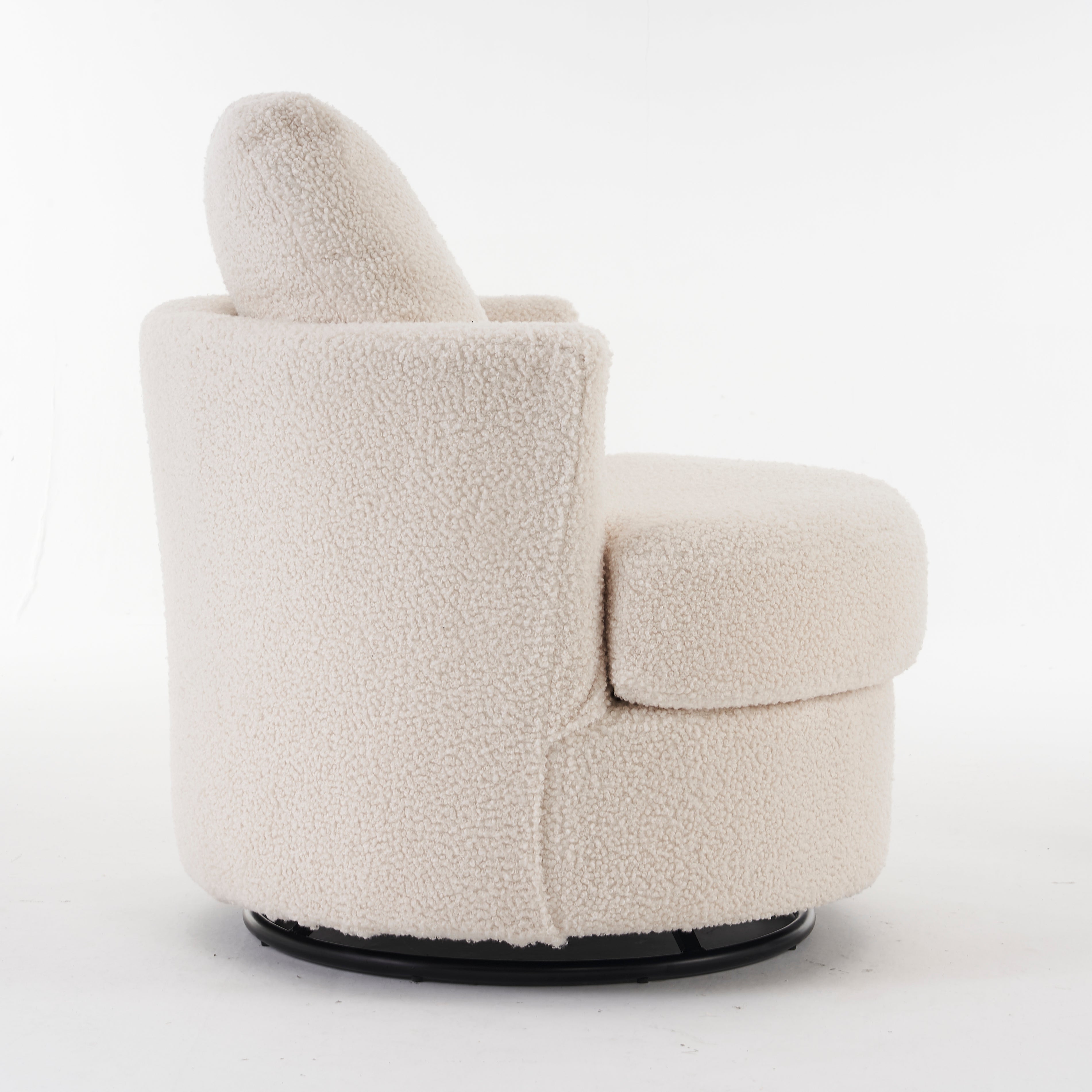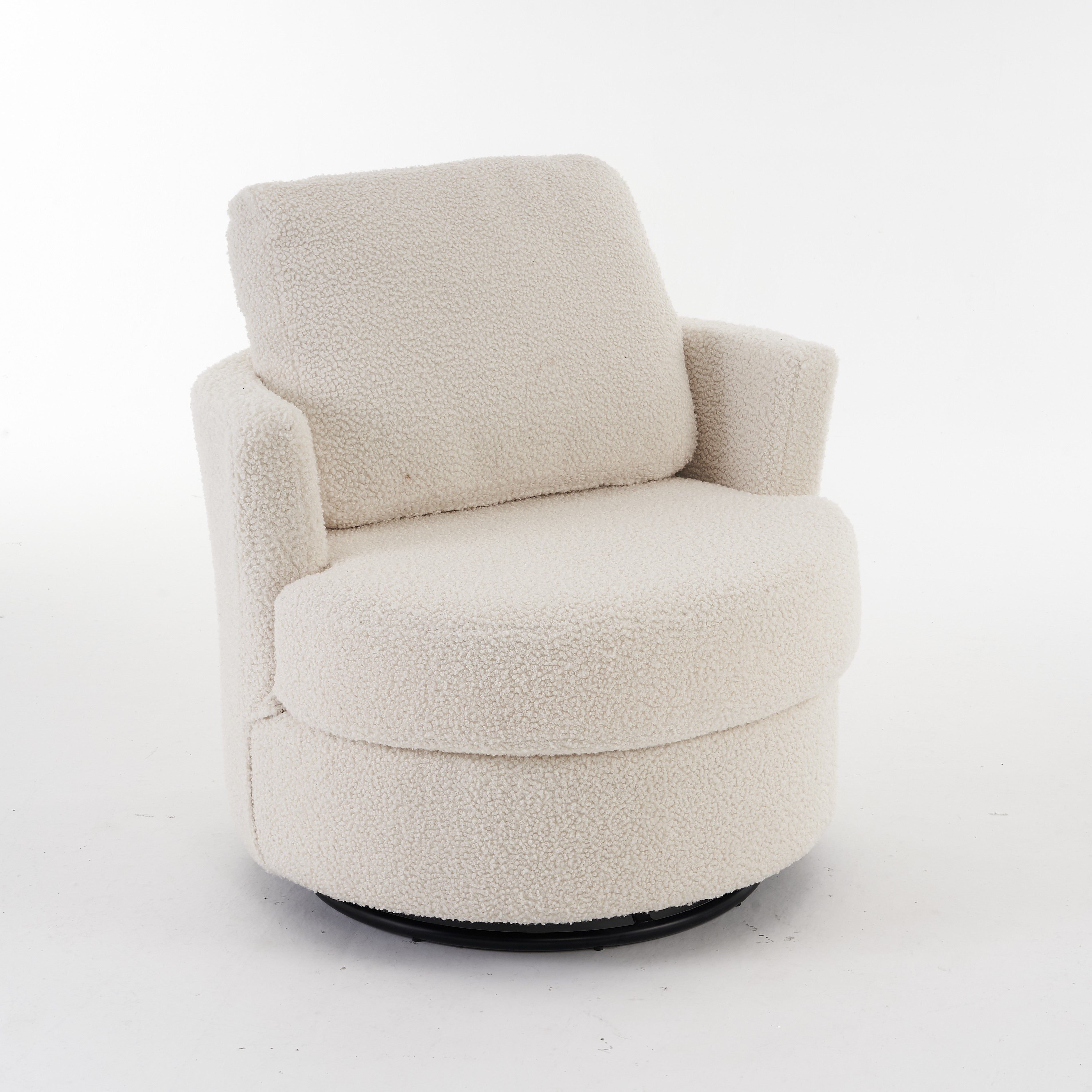 Material: Soft Teddy Fabric, Foam Filled, Wooden Frame, Black Round Swivel Base, Upholstered