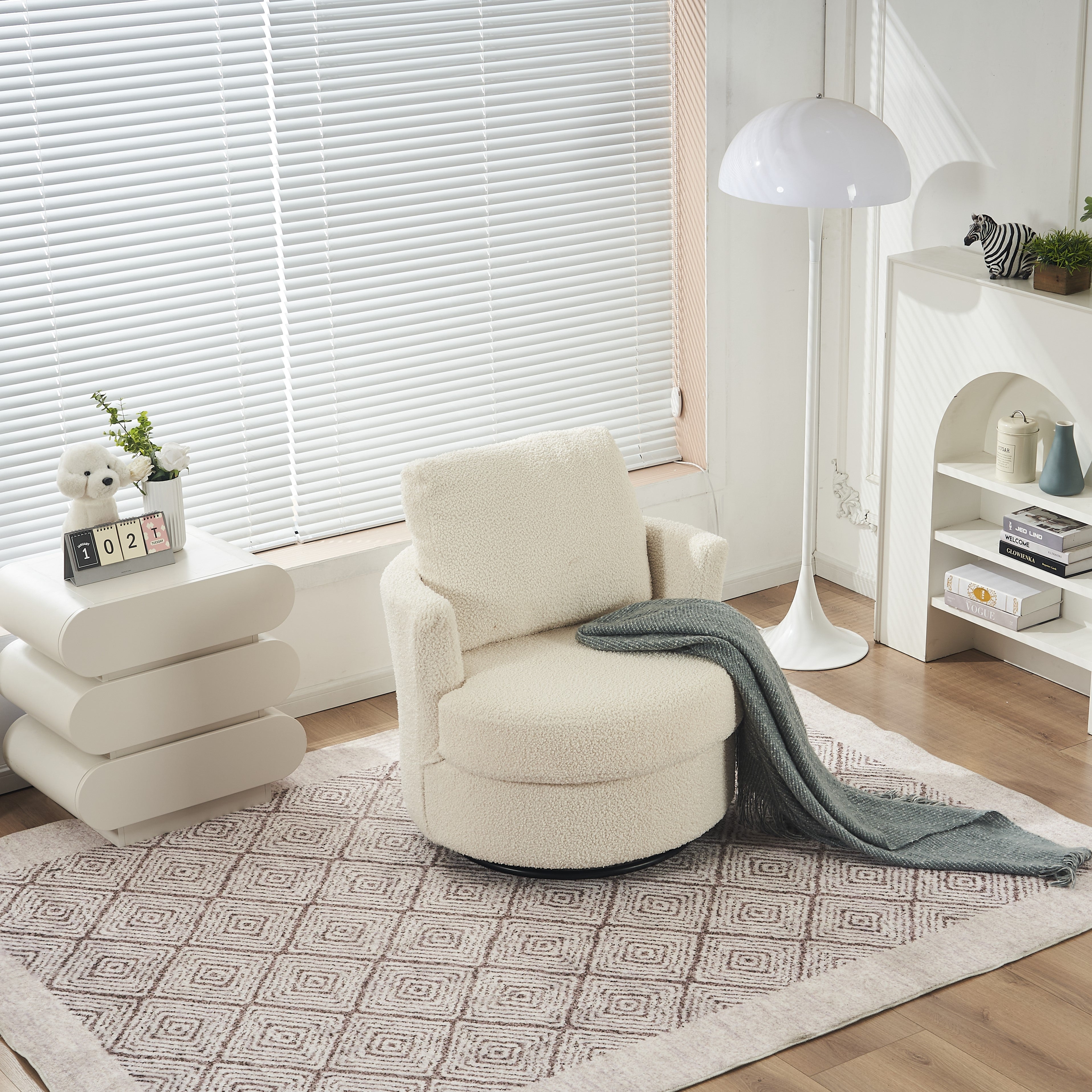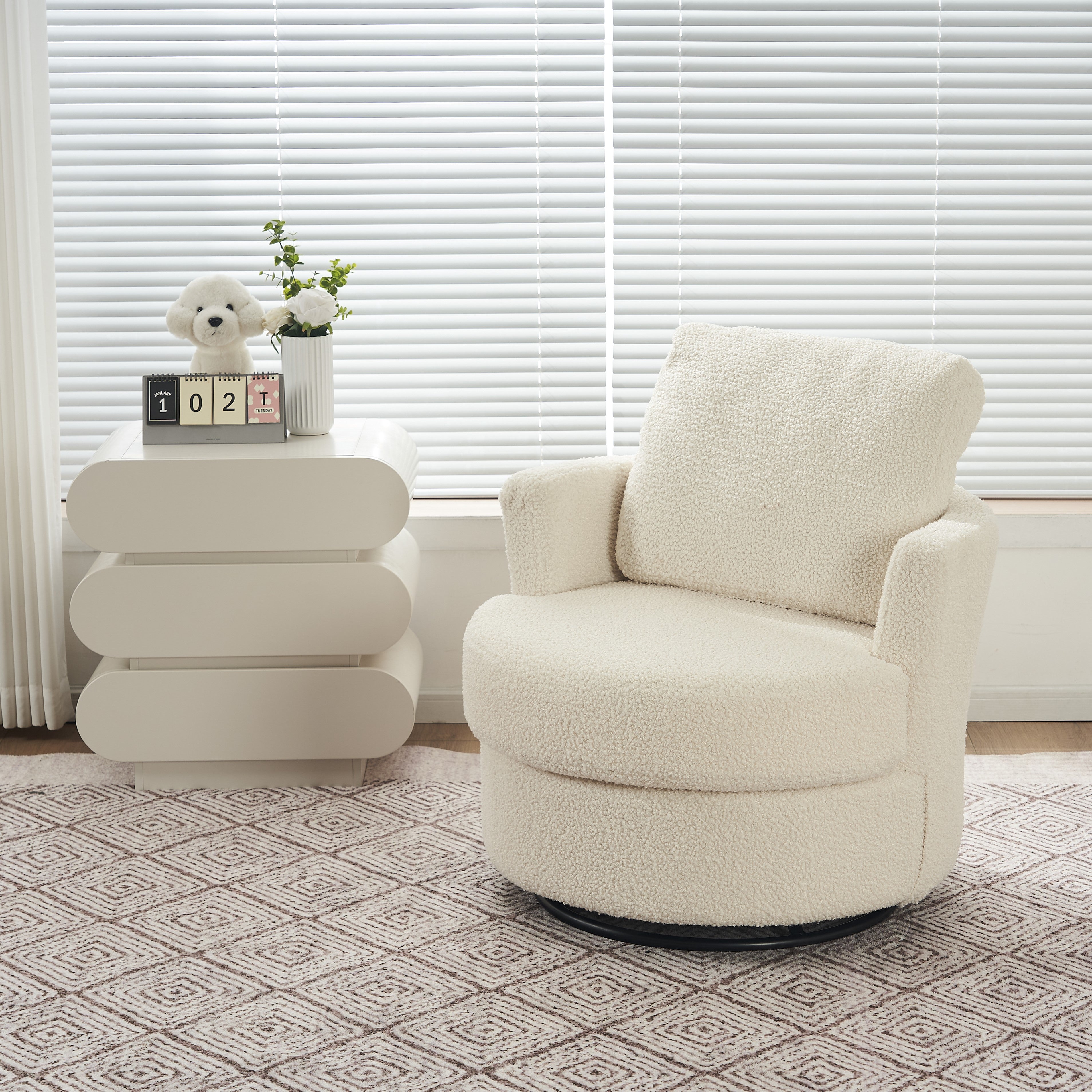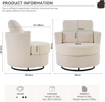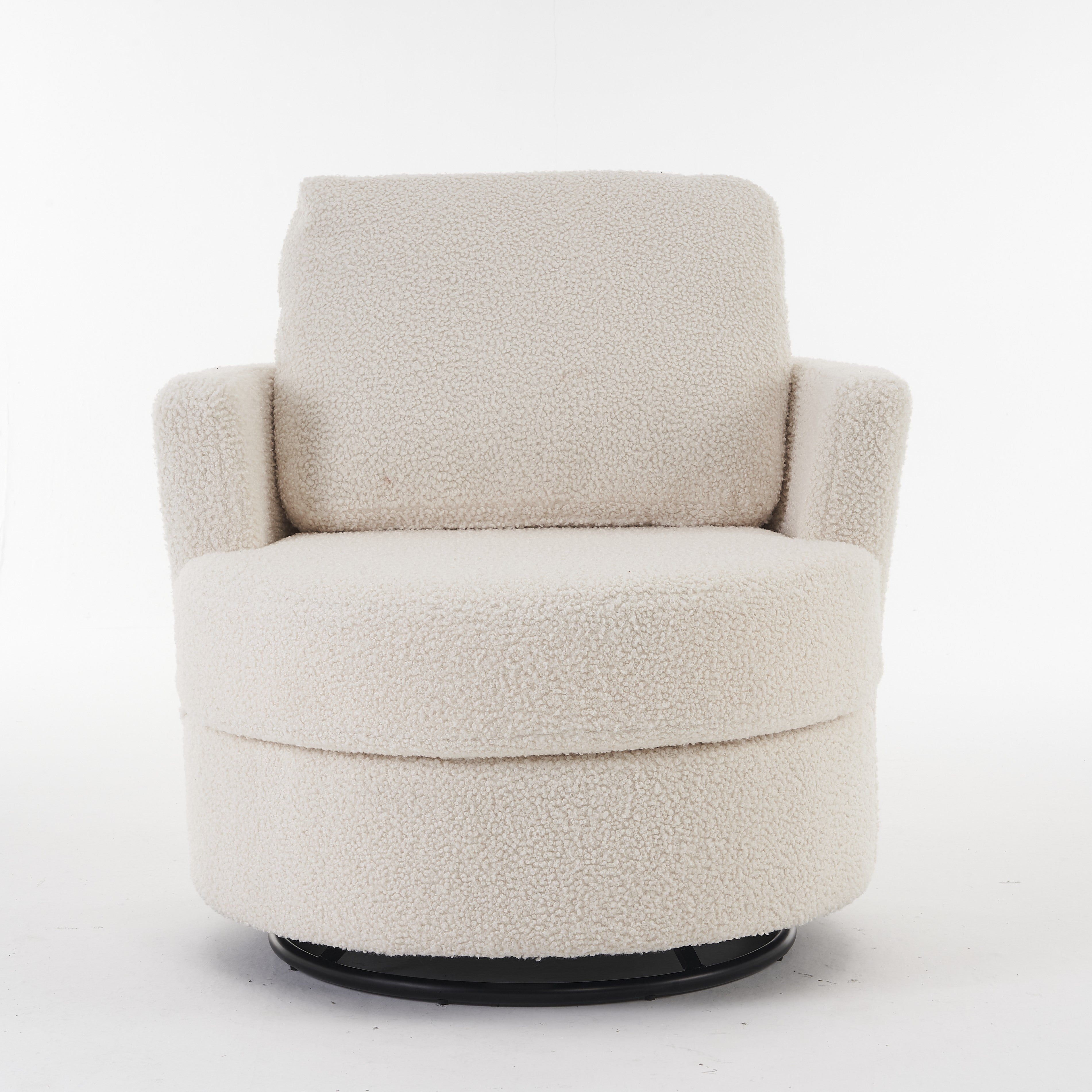 Material: Soft Teddy Fabric, Foam Filled, Wooden Frame, Black Round Swivel Base, Upholstered
