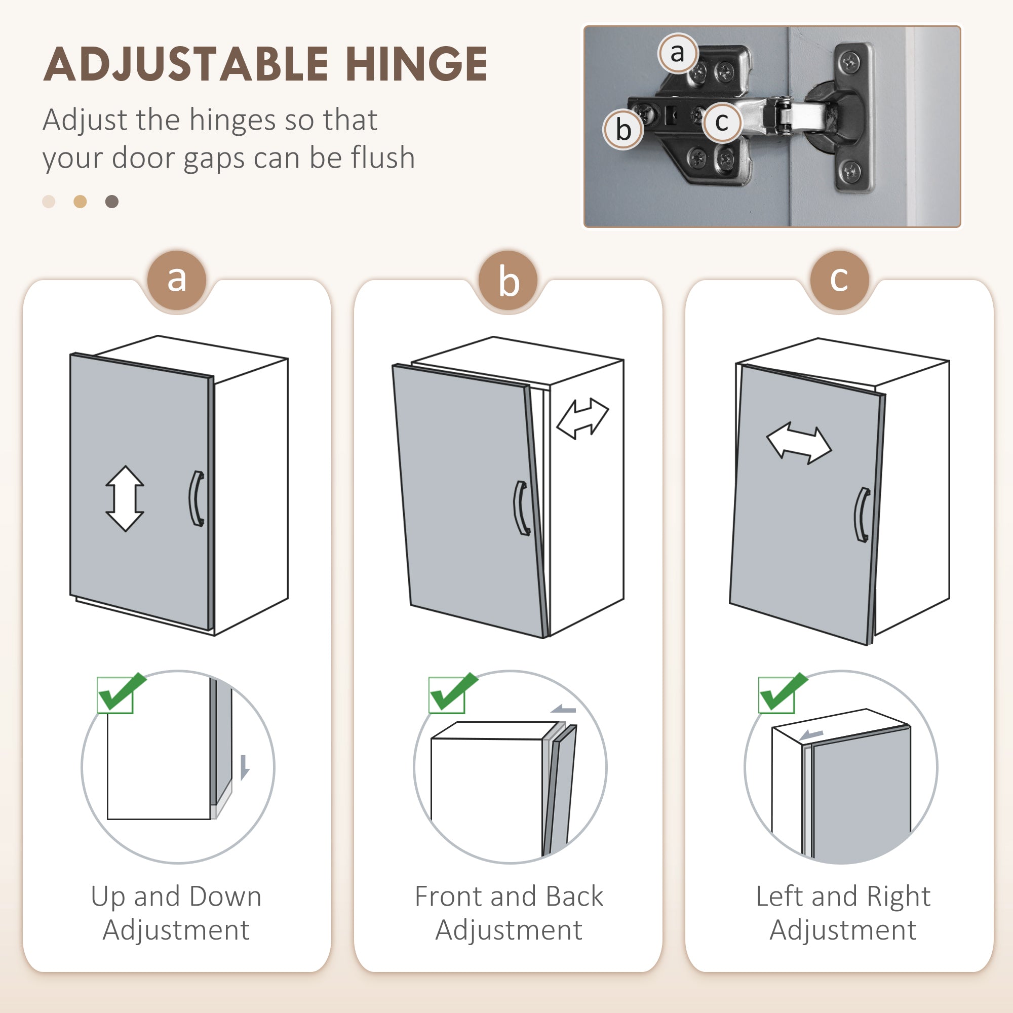 Four individually-opening doors. Adjustable hinges for in-line door alignment