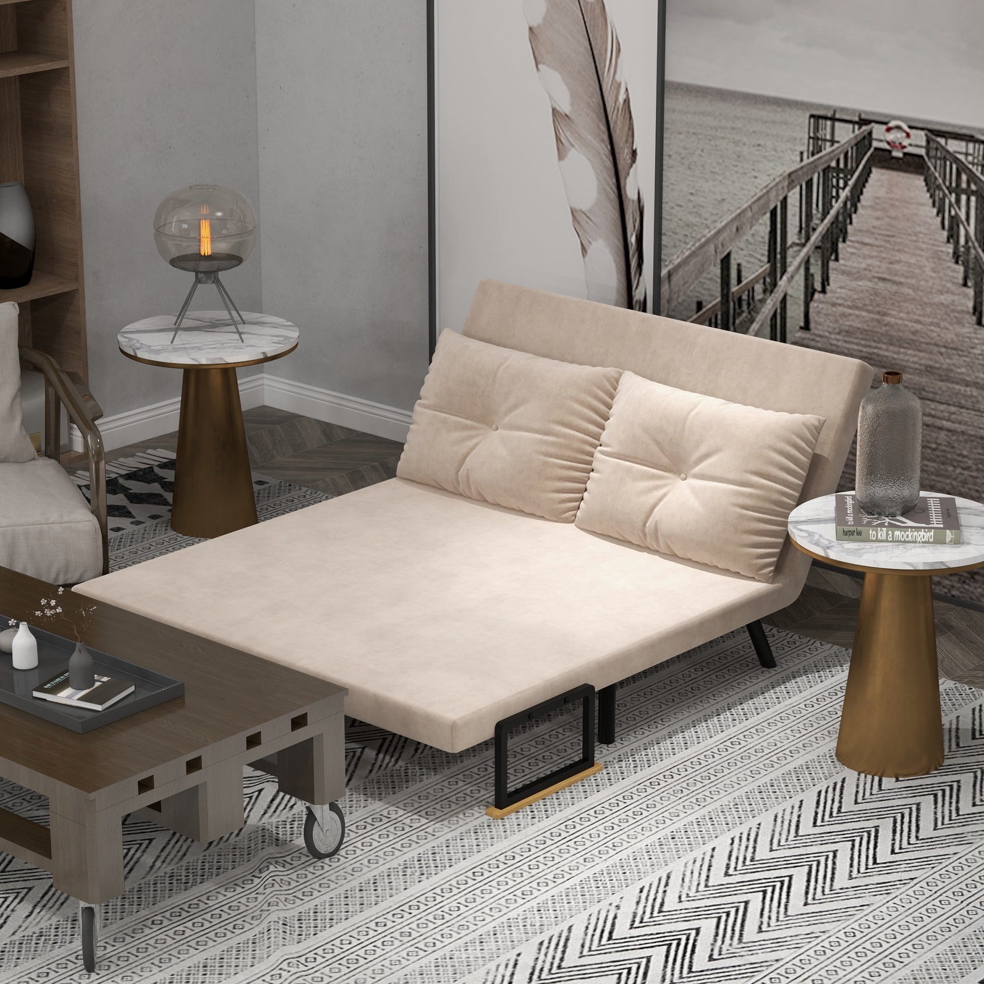 4-in-1 Velvet-Feel Double Sofa Bed, with Pillows - Beige