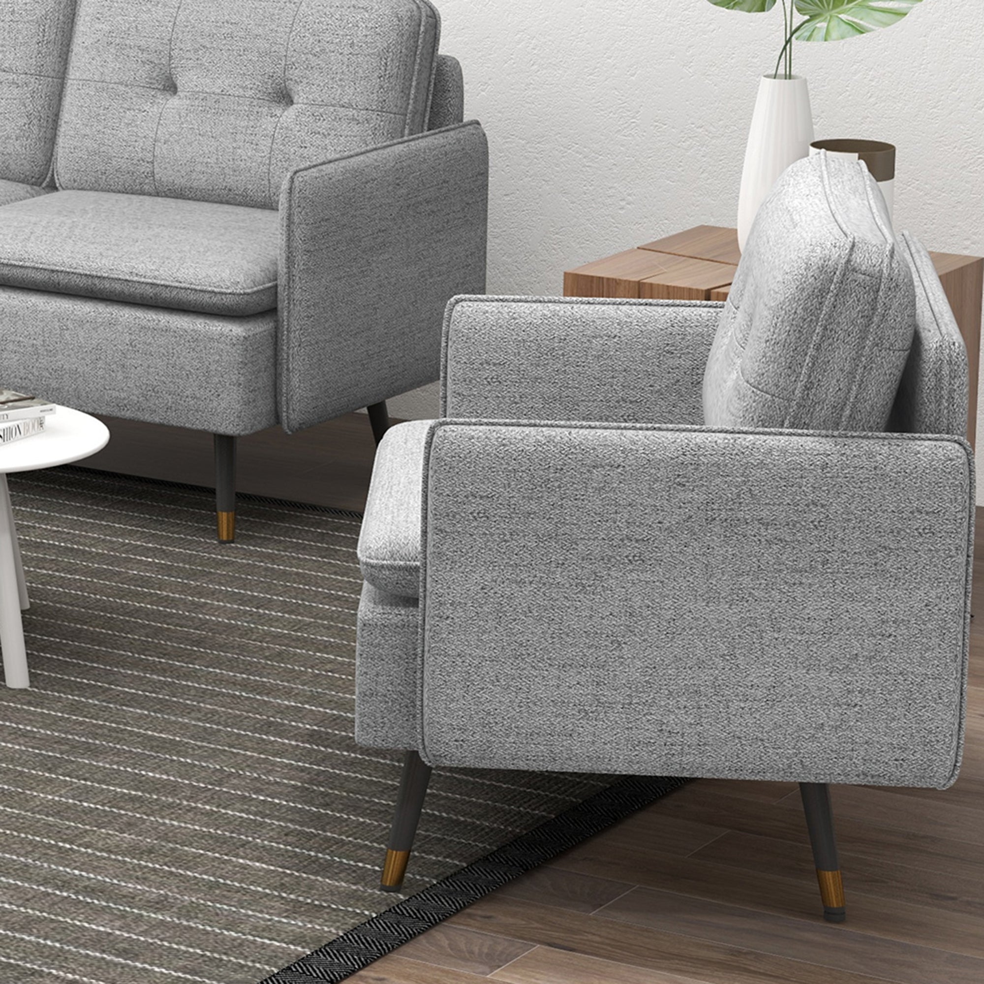 A compact sofa which doesn't scrimp on the comfort - this sofa for living room. Its breathable linen-look upholstery is smooth on the skin, with the padded seat and back cushions for comfort. Button tufting on the back and gold coloured details on the legs for style. Complete with steel legs for strong support.