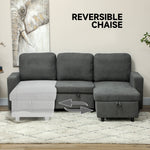 This three seater sofa bed is here from day to night. Convert from a loveseat into a double sofa bed with a simple pull. Plus, utilise the small storage under the chaise, suitable for blankets and more. Whether for comfortable everyday lounging or accommodating overnight guests, this L shaped sofa bed does it all.