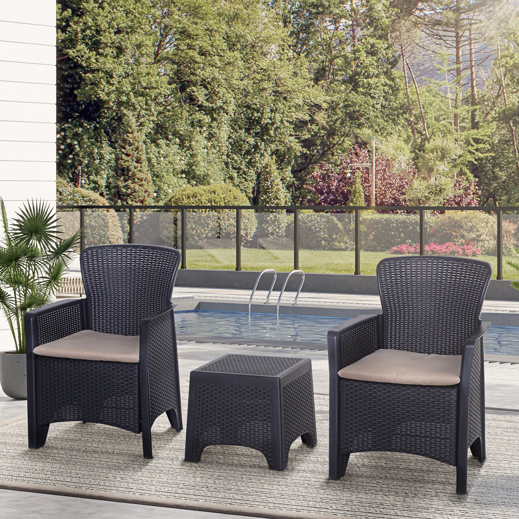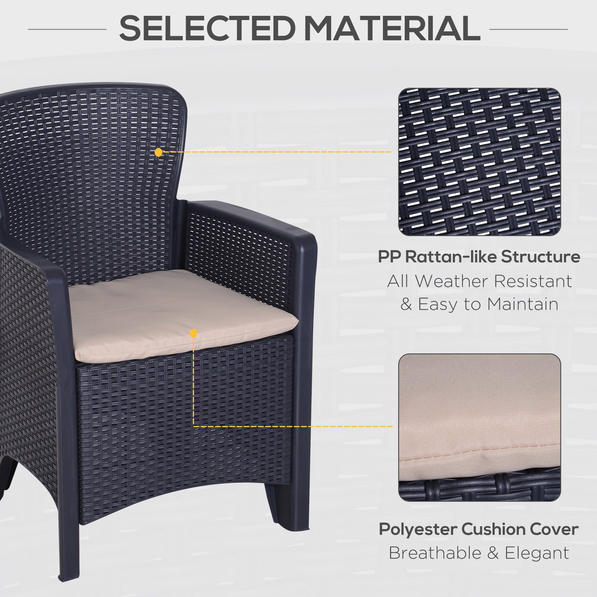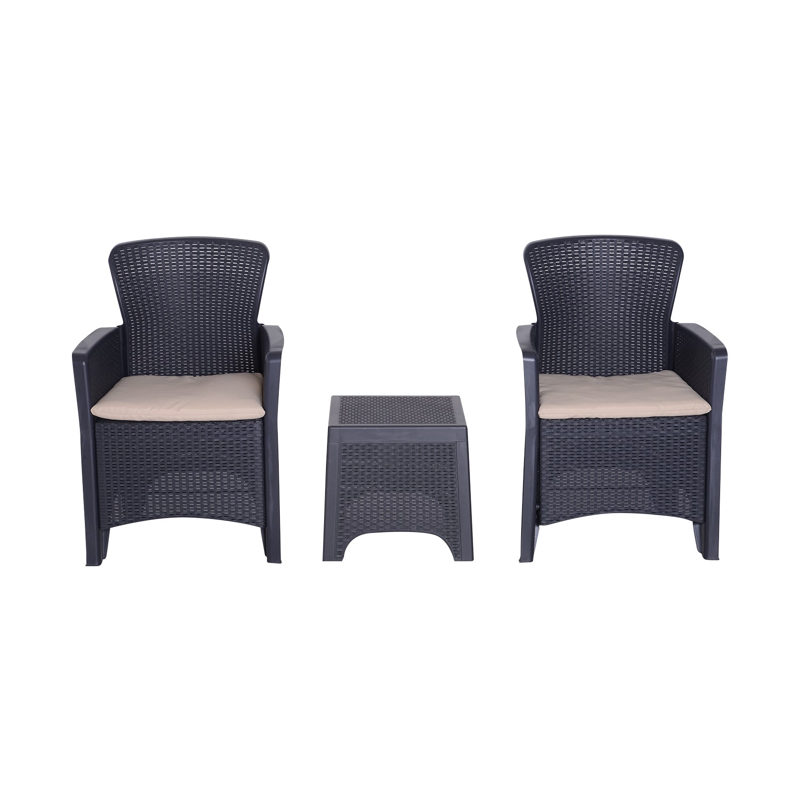 Relax stylishly and comfortably with garden bistro sets. Made from high quality PP material, this balcony furniture is easy to maintain and is weather-resistant, meaning that you don't need to worry about moving it indoors and outdoors weather dependant, and each piece has been made to last with you for years of use. Both seats come with thick padded cushions so you can sit down and relax for hours on end. Our patio table and chairs are the perfect excuse for inviting friends and family over!