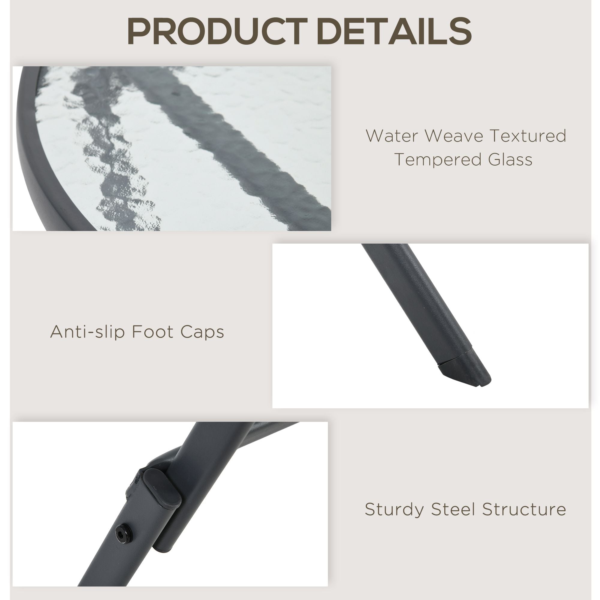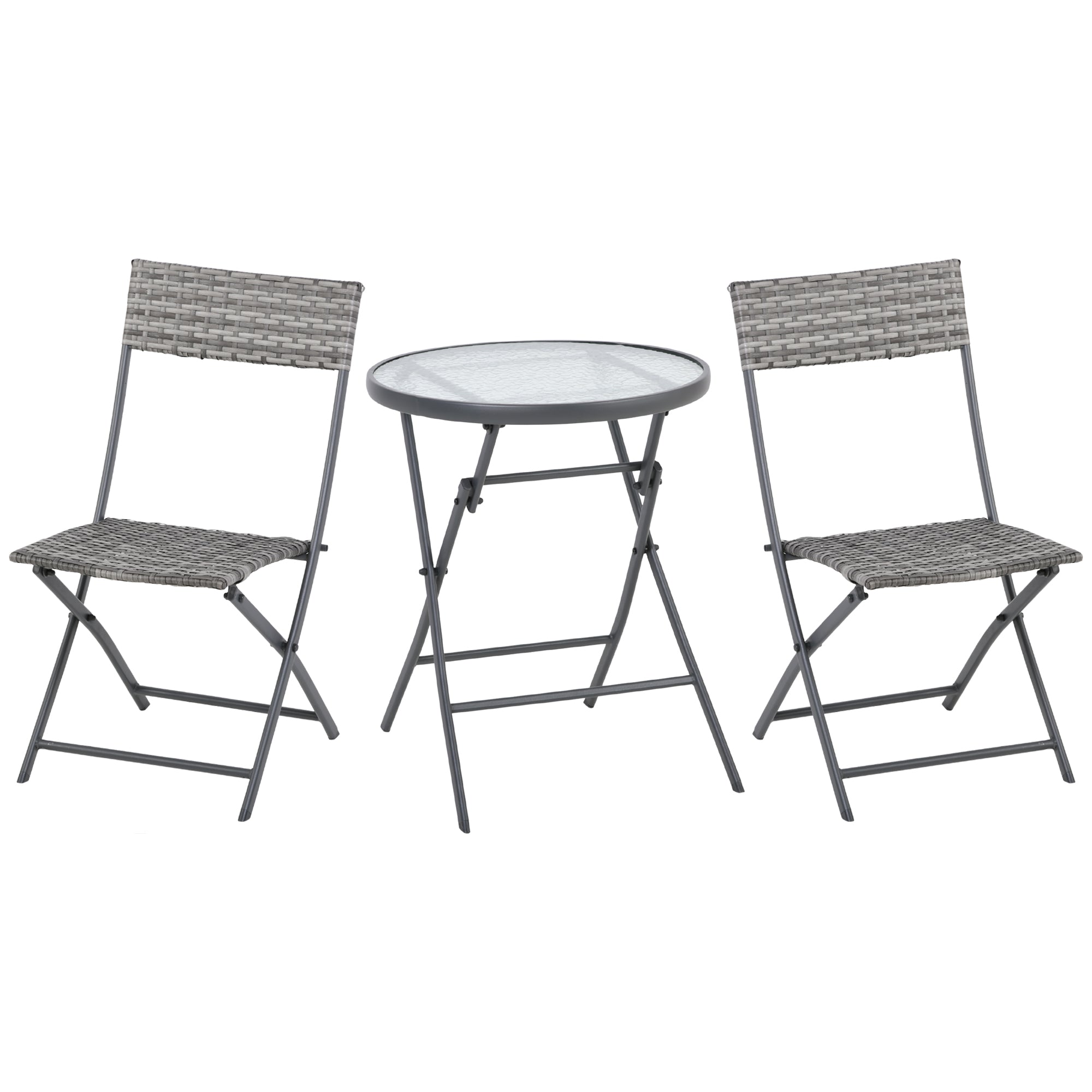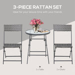 Outsunny's lovely bistro set brings your home decor a delightful upgrade. This foldable option not only provides compact convenience but also features a stunning woven look that instantly upgrades any existing decor. Made of steel frame and durable PE rattan wicker. Round table with tempered glass tabletop allows easy cleaning with a damp cloth, this set offers reliable durability that naturally withstands most weather conditions. Let this bistro set brings you a happy leisure time.
