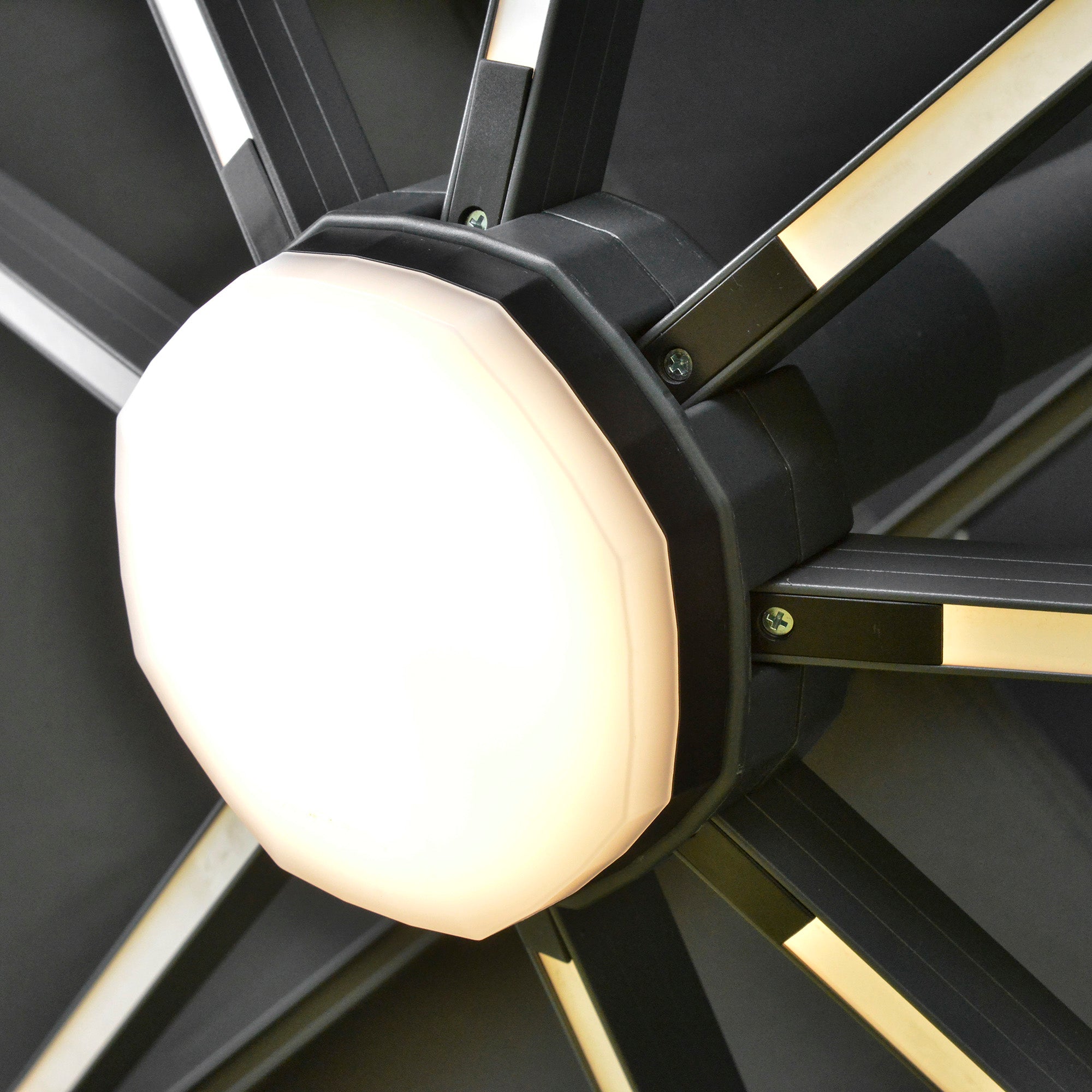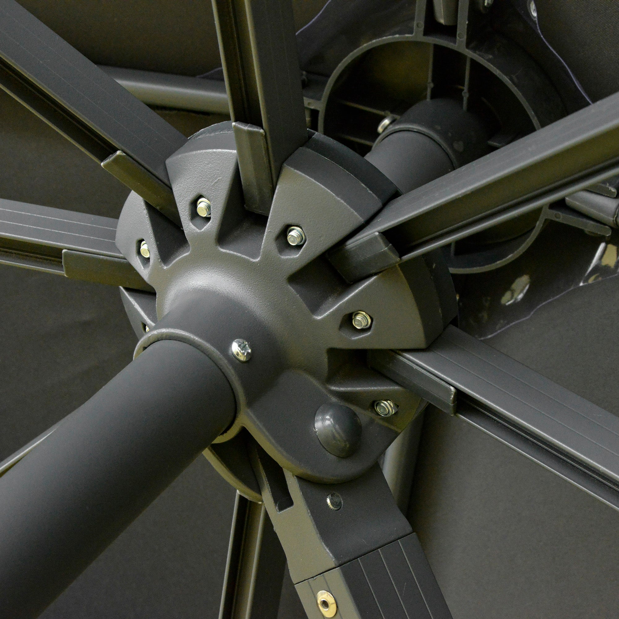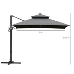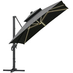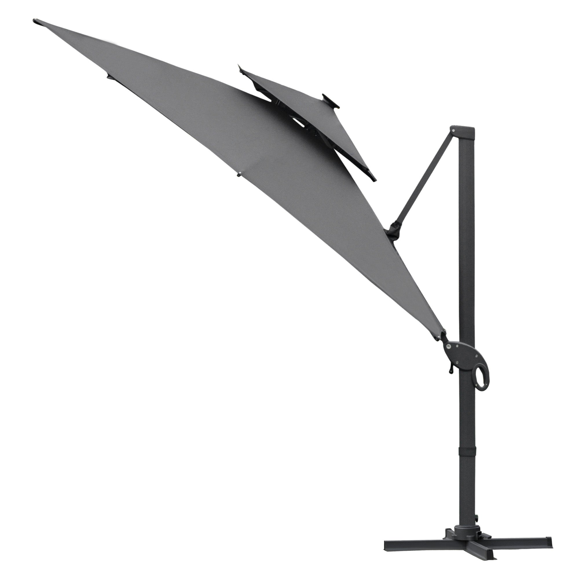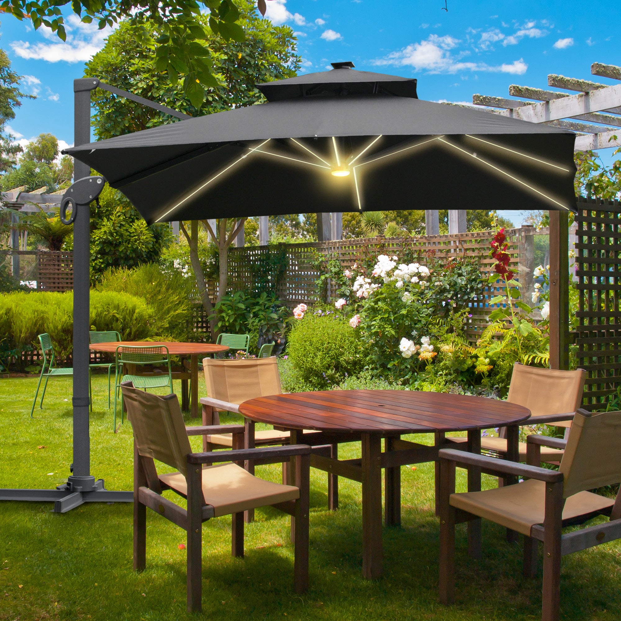 Keep yourself protected whilst enjoying the sun all-day long with this large Cantilever parasol. The polyester canopy provides protection from direct sunlight and heat. Using a crank mechanism for effortless opening and closing, the canopy can rotate a full 360 degrees to keep you covered all-day long. Powered by panel solar, the LED lights on the ribs can provide you more lights at night.