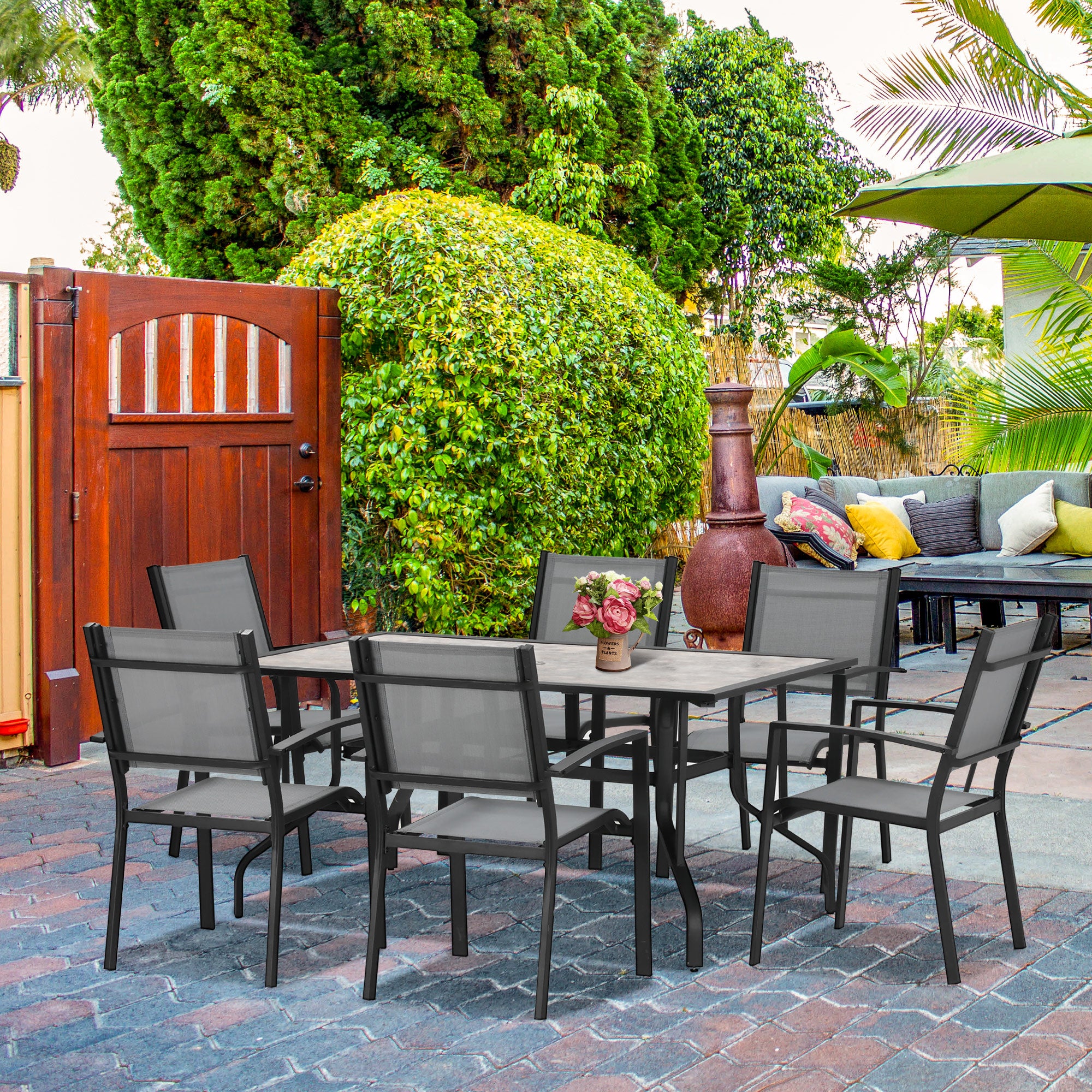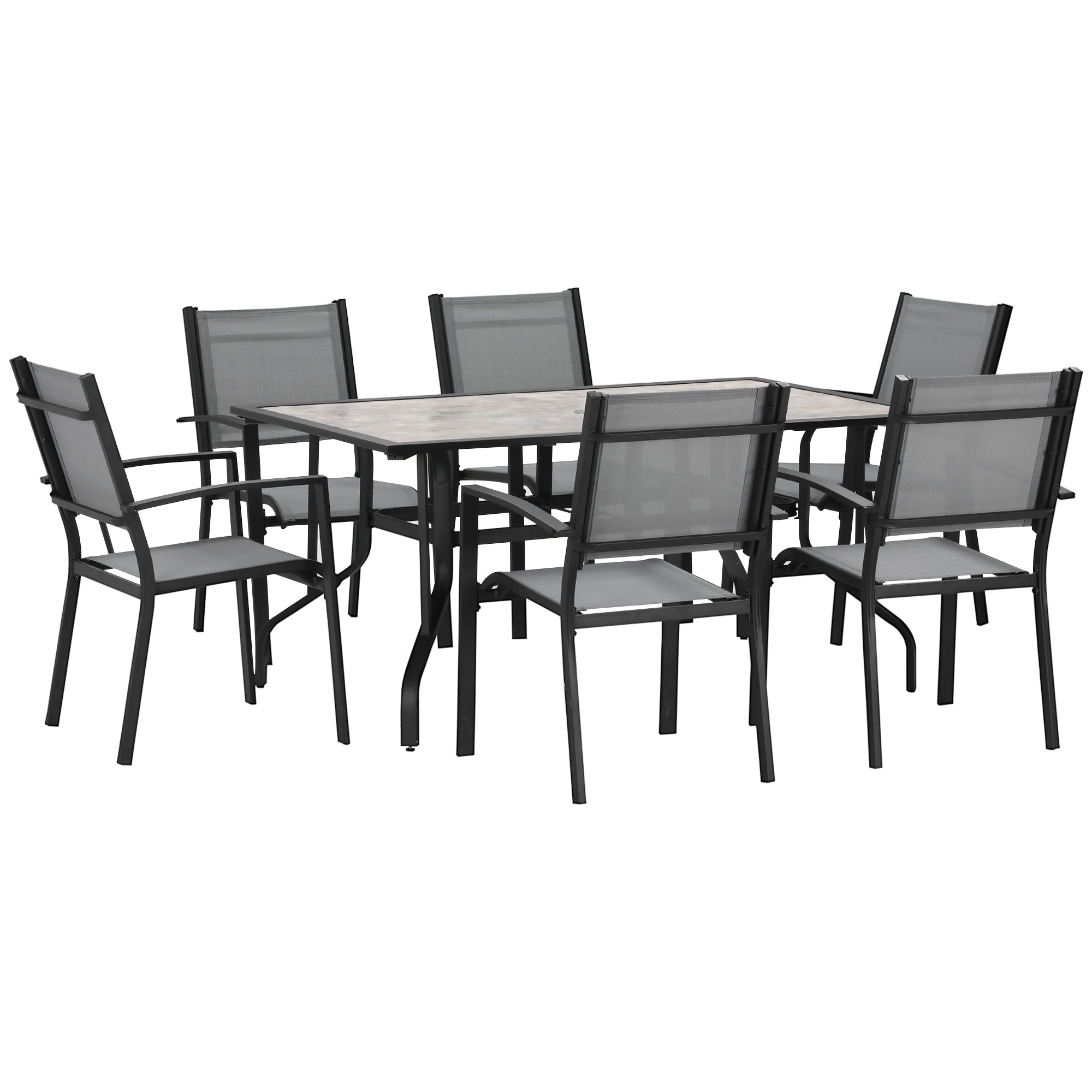 7 Pieces Garden Dining Set, 6 Seater Garden Table and Chairs with Parasol Hole, Outdoor Furniture Armchairs and Stone-like Plastic Top Table with Breathable Mesh Fabric Seat, Grey