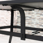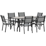 This garden dining furniture set is a must-have in your garden - relaxing with family and friends this season and beyond. Comes with six outdoor chairs and a large dining table; the table is fitted with a durable plastic table top so you can dine from with full support. Each chair comes with a mesh panel seat and back for comfort, with high backs and arms for support. The table features a middle hole for a parasol umbrella.