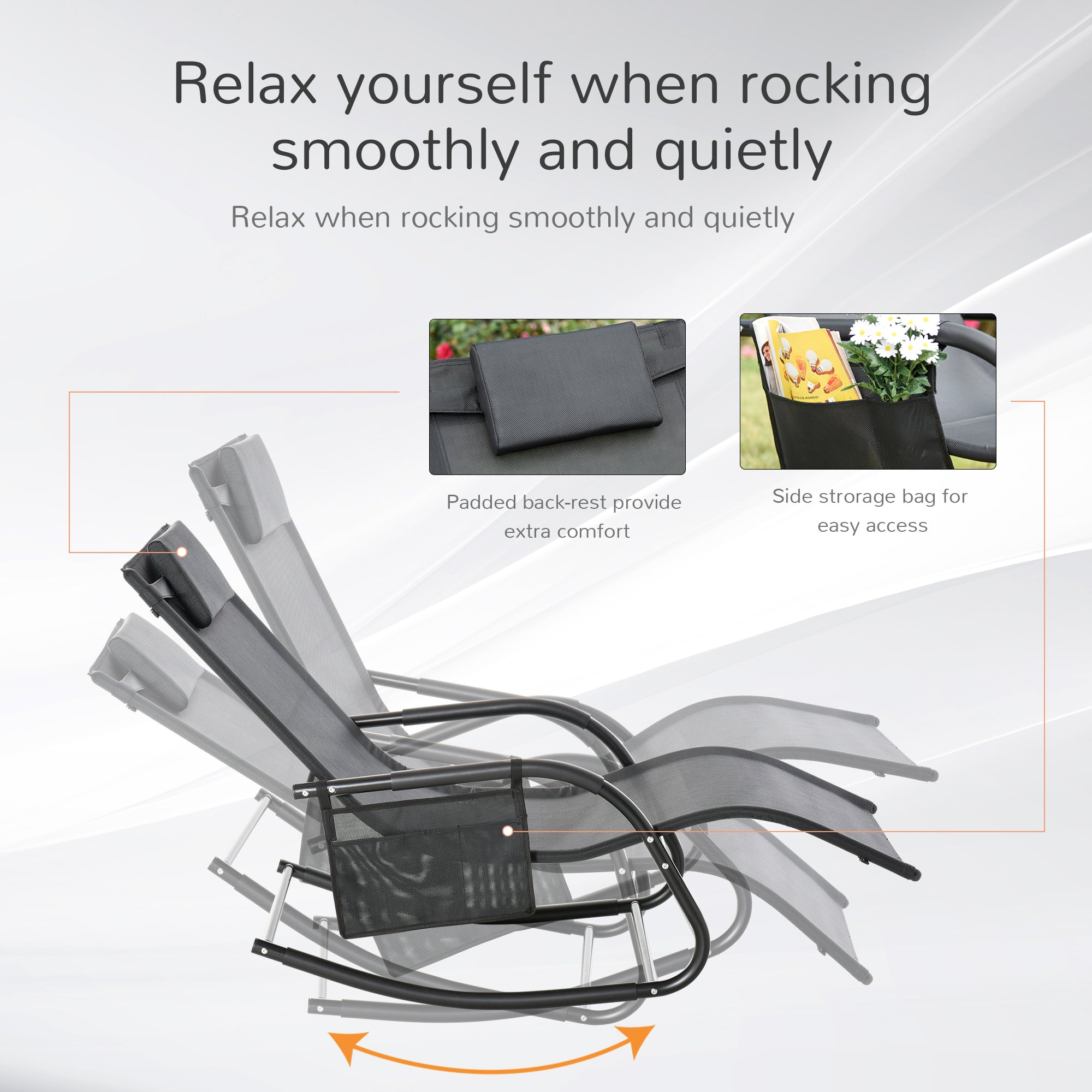 Outdoor Garden Rocking Chair, Patio Sun Lounger Rocker Chair with Breathable Mesh Fabric, Removable Headrest Pillow, Armrest, Side Storage Bag, Black