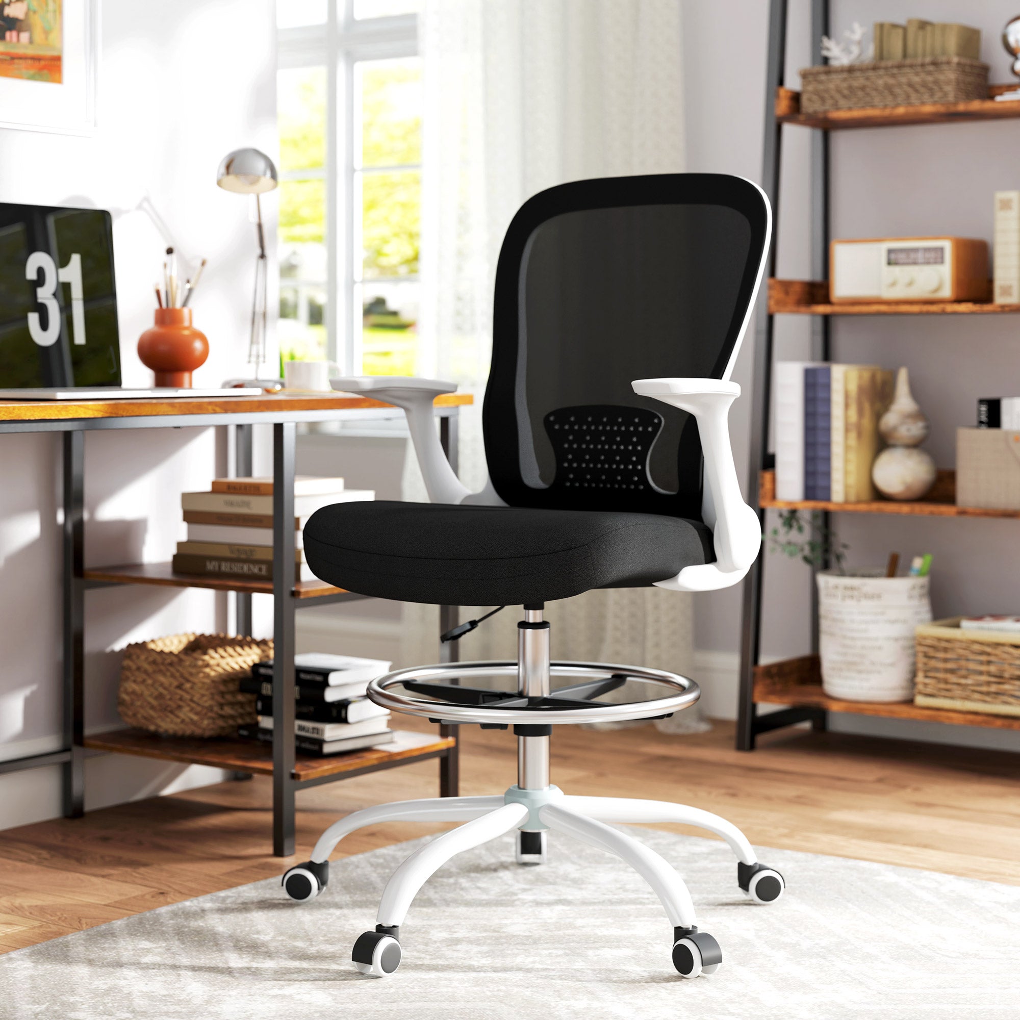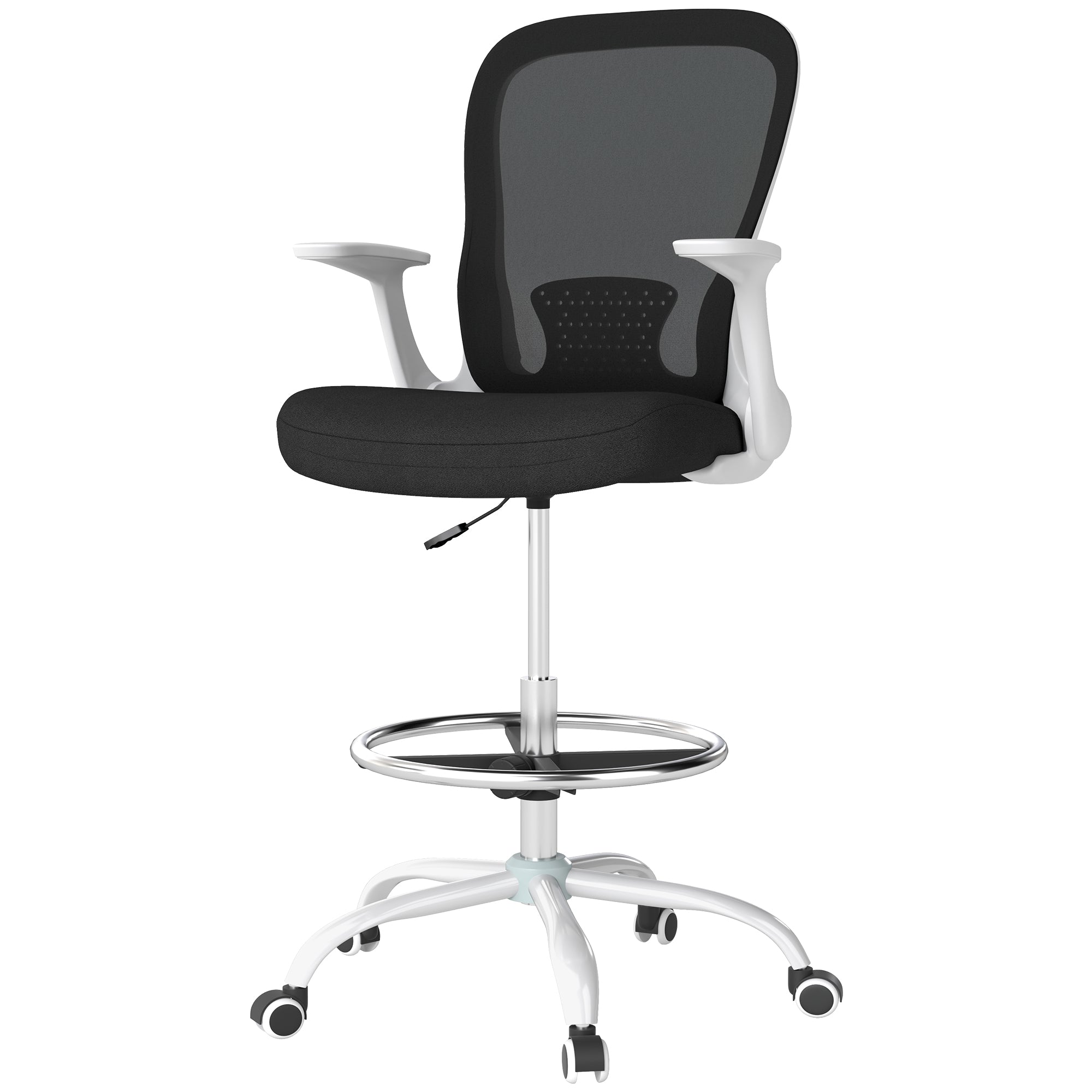 Draughtsman Chair, Mesh Drafting Chair, Ergonomic Office Chair with Flip-up Armrest, Adjustable Foot Ring, Black White