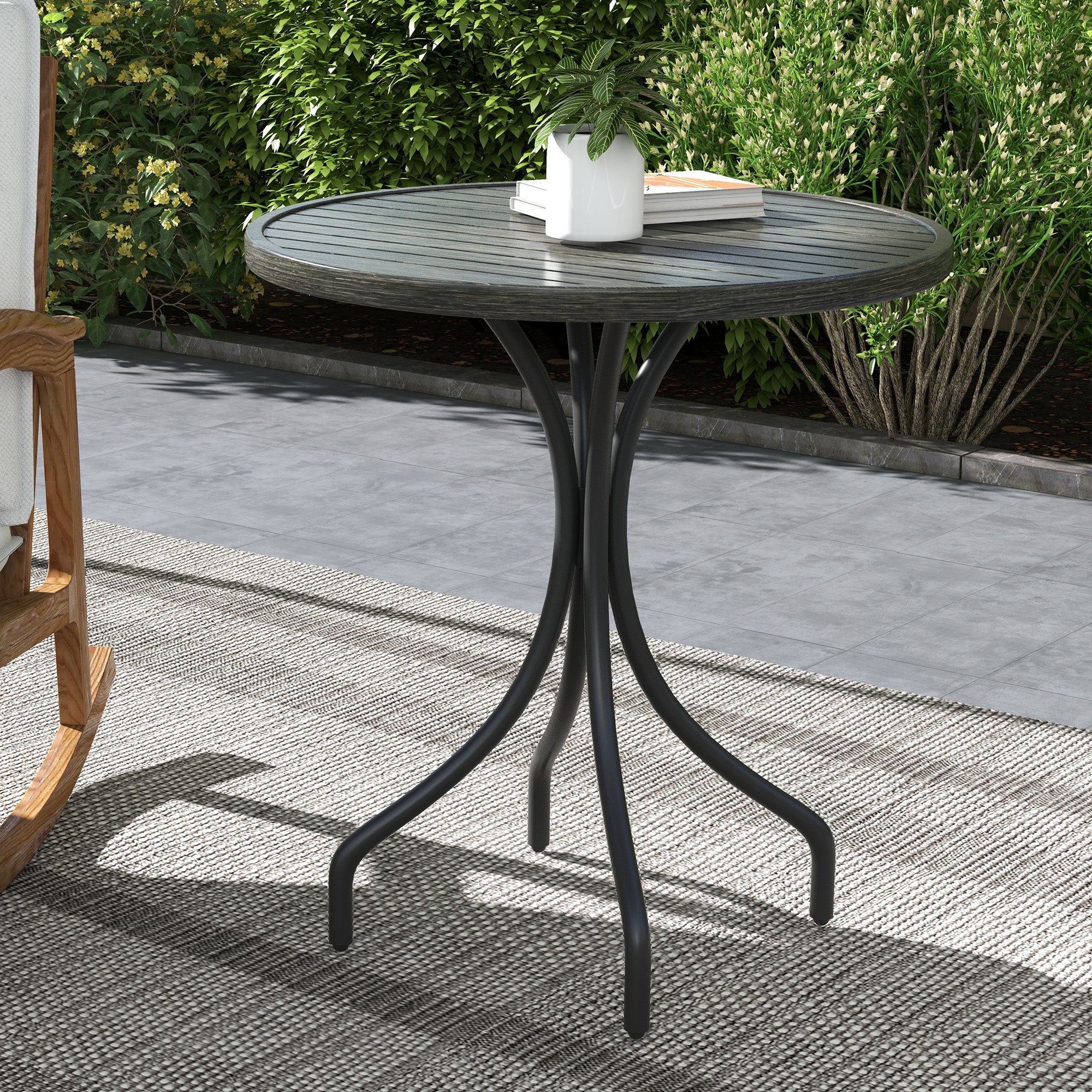 Enhance your outdoors with this end table. Slatted tabletop is stylish and practical, preventing water building up and quick drying. The galvanised steel frame, with a powder-coated finish, means a strong and supportive core. This round garden table is suitable for plenty of occasions.