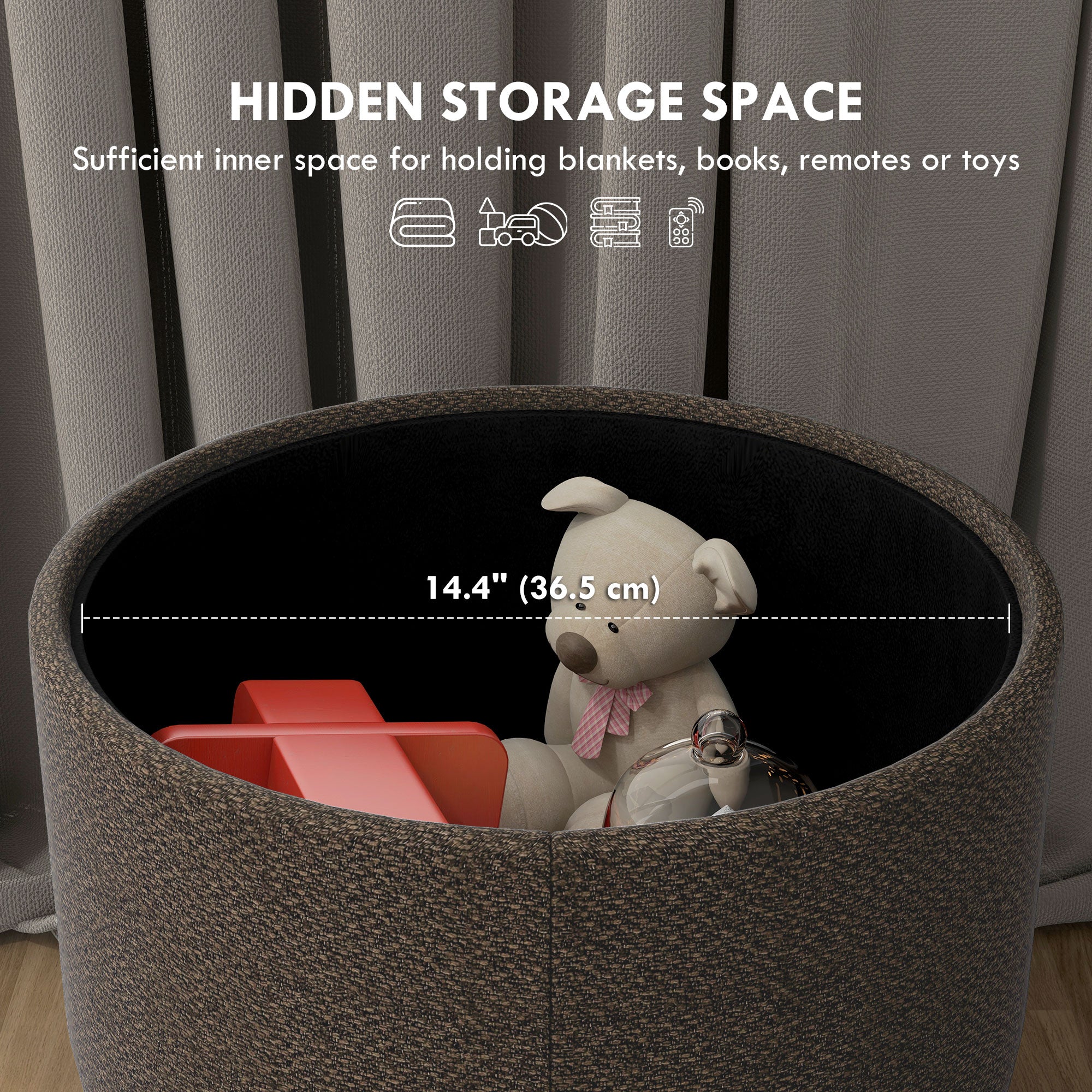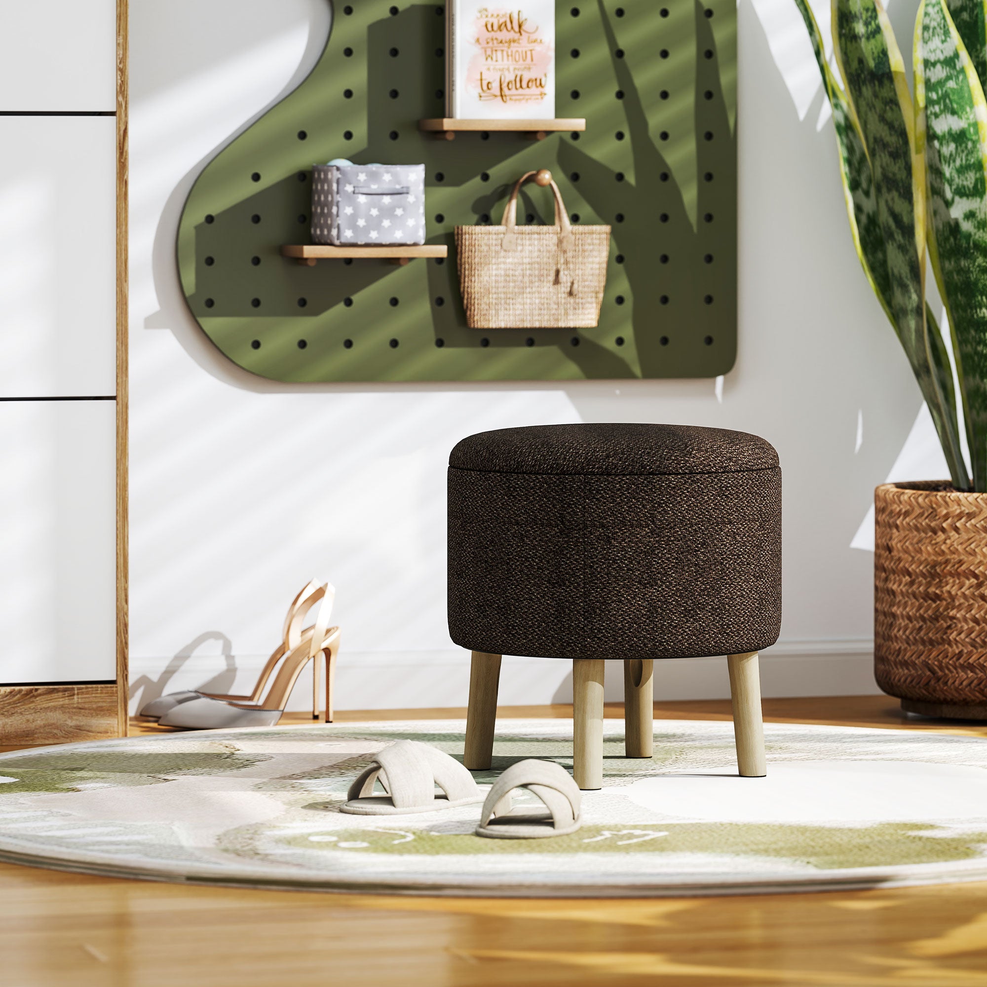 Round Ottoman Stool with Storage, Linen Fabric Upholstered Foot Stool with Padded Seat, Hidden Space and Wood Legs