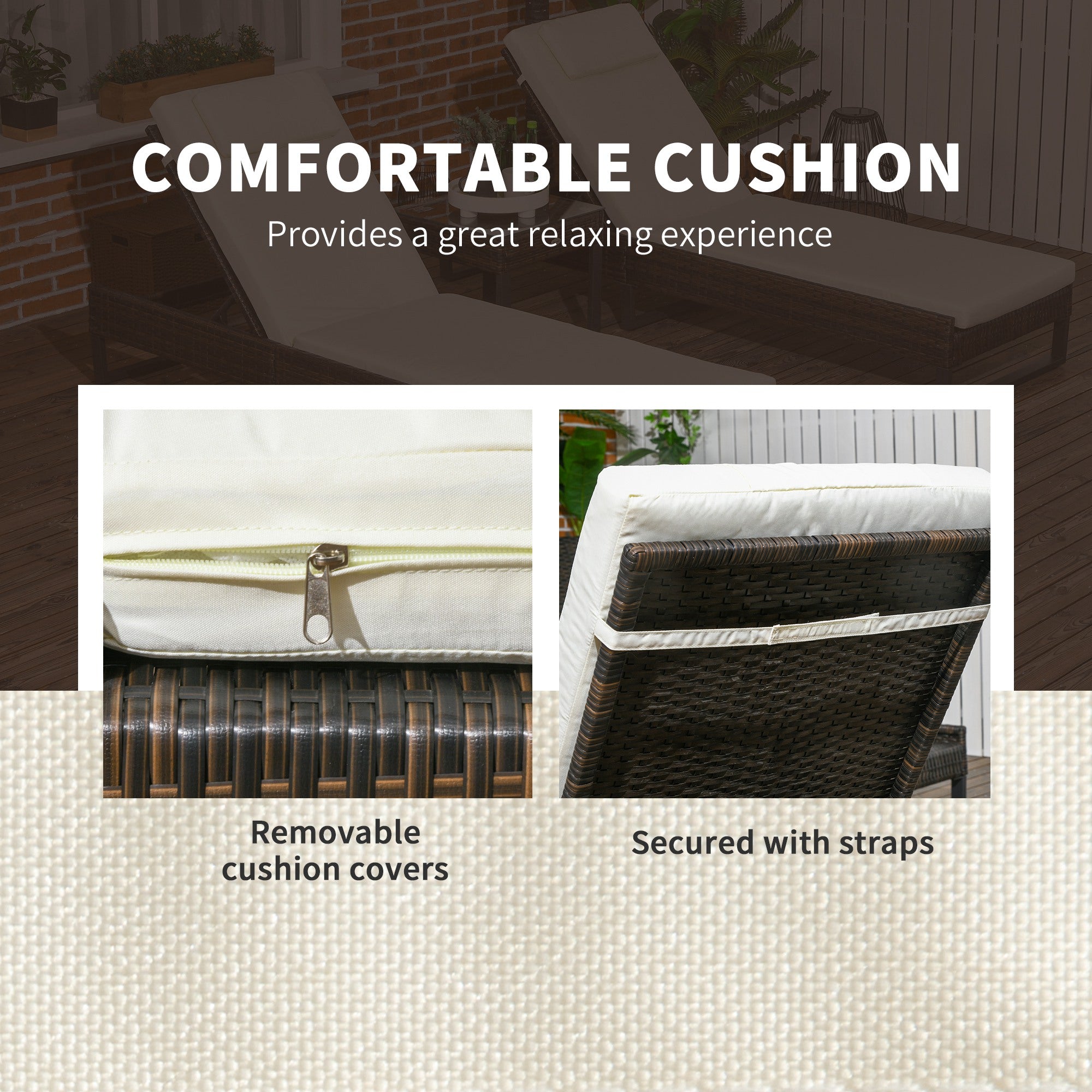 Longline seat cushions for comfort, secures to lounger with straps