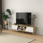 Simple, spacious storage comes in Scandinavian style - thanks to this TV table. The wood-effect body and white doors of this piece make it a forever-beautiful piece which effortlessly matches with your current furniture. It features two end cupboards and two middle shelves - plenty of room for media devices, movies, games and whatever else you need. The flat tabletop caters for screens up to 65". Media unit is complete with wooden legs for full support.
